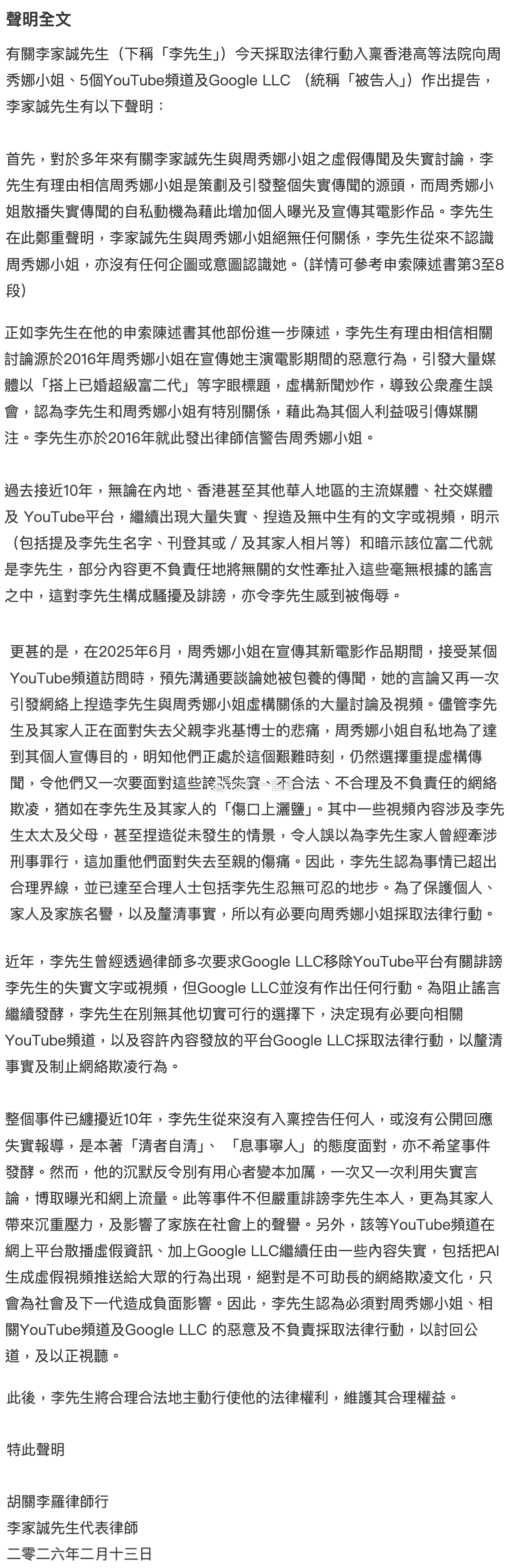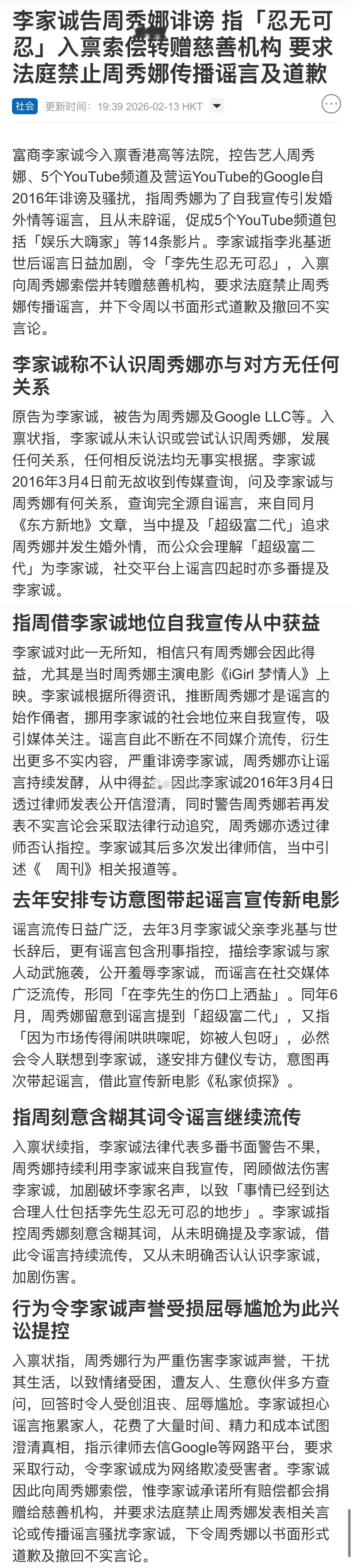 一句话总结就是,李家诚觉得是周秀娜为博炒作一直放任流言,令他感到自己被侮辱了,整个家族名誉受到损害,所以就把周秀娜、谷歌和油管相关频道都给告了,并承诺赔偿款会捐给慈善机构……