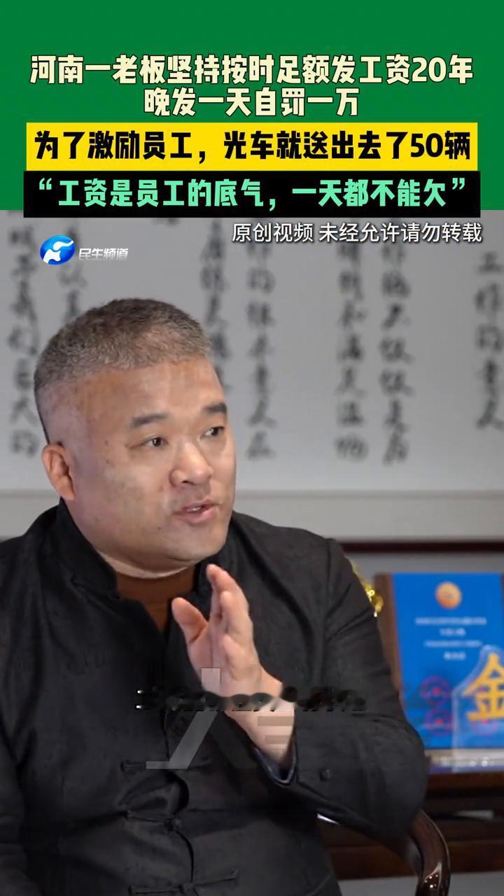 刚刚发出去的宝马、红旗、奔驰也有接近五十辆,背着二十年工资没有晚发过一天,确保给员工的工资按月租额发放。如果超过十五号,我是自罚一万块钱。工资代表着员工的自信,工资能够让员工有状态,公司的什么钱都可以欠,就是员工的工资一天都不能欠。