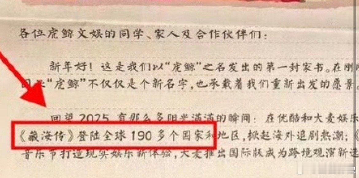 虎鲸文娱给集团和业内合作方发的马年家书,2025年只提到了一部剧就是藏海传。这很令虎鲸骄傲了。