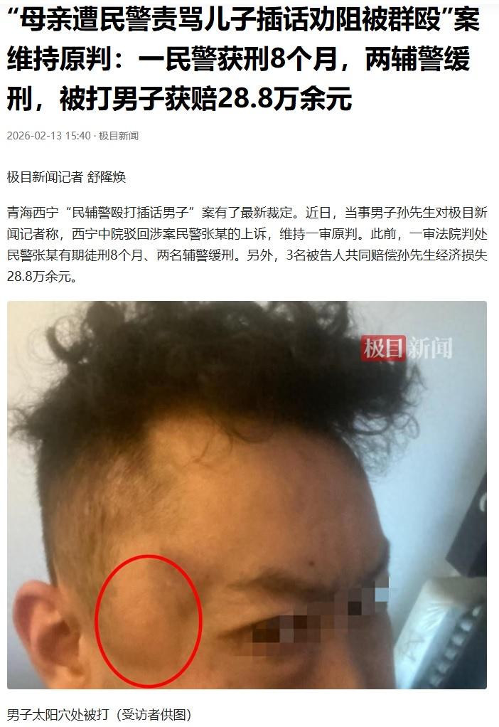 一句劝慰竟引来围殴!西宁原民警张某拖拽孙先生进女厕围殴,被判刑后上诉,日前被驳回。两名辅警被判缓刑未上诉。受害人3年维权路走得不易。 2022年8月29日,孙先生扶着脚伤初愈的母亲下楼做核酸检测,因健康码异常,被带到了辖区派出所。 母亲不停地解释说,自己遵守了防疫的各项规定,但民警张某却极不耐烦,大声喝止。 孝顺的孙先生轻声劝母亲:“妈,别说了。”这一句普通的劝慰,竟惹恼了张某。 他伙同两名辅警,把孙先生拖拽到女卫生间,进行了围殴。 孙先生回忆说,当时他听到张某说了一句:“厕所里没有监控,打完就说他自己摔的!”被打后一度昏迷。 事后伤情鉴定显示,孙先生全身多处受伤,其中右侧肩胛骨骨折,构成了轻伤二级。这达到故意伤害罪的立案标准。 孙先生多次举报,要求严惩张某等三人的犯罪行为。张某等人赔偿了孙先生10万元钱,希望双方和解,但孙先生坚持追究三人的刑事责任。 2023年相关部门立案侦查。2025年11月,张某因故意伤害罪被判刑8个月,两名辅警被判8个月并缓刑一年,三人共同赔偿28.8万元。 张某不服一审判决,提出了上诉。在二审中,他列举三个理由,试图推翻原判。 首先,他试图把责任推给孙先生,称自己当时在询问他母亲有关情况,是在执行公务。 张某认为孙某主动插话干扰办案,后续又利用网络舆情,干预司法部门的正常办案。 在双方的冲突中,孙某存在重大过错,应该减轻自己的责任。 笔者认为,张某这是在混淆是非。执法对象的任何不当言行,都不能成为执法人员使用暴力的理由。执法人员不可滥用职权。 更何况法院认定,孙先生劝阻母亲的行为,对引发冲突有一定责任,但仅属于轻微过错,并非重大过错。 其次,张某提出司法鉴定意见存在瑕疵。 他认为三份司法鉴定意见存在矛盾,不能确定孙先生伤势的形成时间,不能证明他的伤情与张某的殴打行为有直接的因果关系。 法院经过对司法鉴定意见的审查,认为本案的司法鉴定程序是合法的,依据是充分的,而且不是孤证,和其他证据形成了完整的证据链,足以证明孙先生的伤情是由三名被告共同殴打行为造成的。 第三,张某试图把责任推给两名辅警,称自己没有伤害孙先生的主观故意,两名辅警自作主张,下手重了。 笔者认为,张某的这个理由显然不成立。虽然没有证据证明他们三人事先有串谋,但是在拖拽和殴打过程中,三人实际形成了共同犯罪。 而且张某指使辅警将孙先生拖进女厕,意图规避监控,主观恶性更大。 好比“带头闯祸”和“跟着起哄”的区别,主犯是策划、指挥或起核心作用的人,需承担全部犯罪责任,量刑更重;张某是主犯,被判处实刑,是罪有应得,将被清理出警察队伍。 被动参与施暴的辅警,是从犯,依法可从轻、减轻处罚,所以判了缓刑。 此案的判决结果不仅维护了孙先生的正当权益,更是对执法人员的警示,执法必须依法履职,任何试图规避监督,滥用暴力的行为,终将收到法律制裁。 等待三年终得正义,民警被判刑、辅警缓刑,你认为这样的量刑是否合理?欢迎到评论区留言交流,一起为公平正义发声。