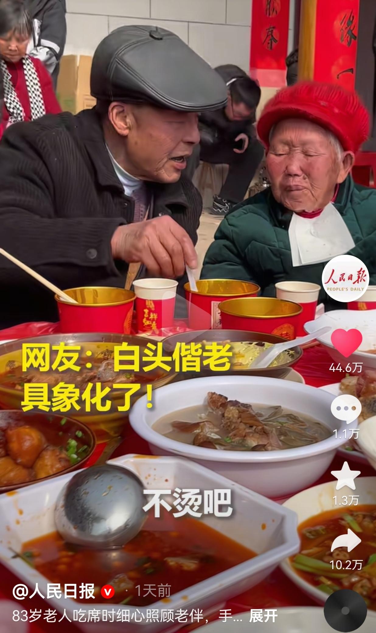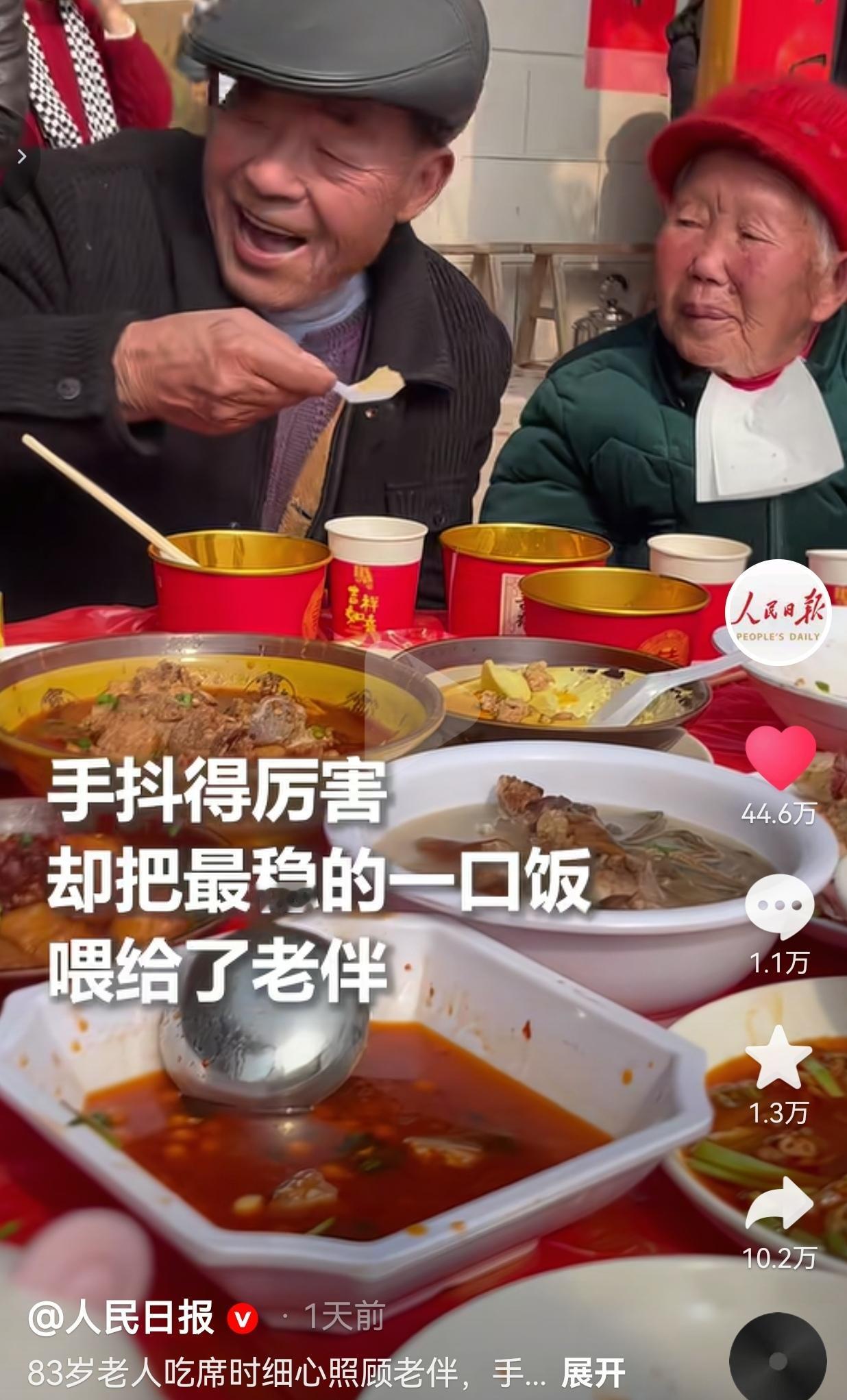 这才是爱情该有的样子!爱情在这一刻真的具象化了!2月11日,四川南充,一位83岁的老爷爷带着半身不遂的老伴参加一场喜宴。 由于老伴不能自理,老爷爷全程给老伴喂饭。尽管,岁月在他的身上留下了痕迹,他的手在夹菜的时候明显在抖,就连筷子都有点不听使唤。 可当他舀起一勺饭,小心翼翼地递到老伴嘴边时,在喂之前,害怕烫到老伴,还特意吹一吹,等菜凉了之后,才送进老伴嘴里。 视频中,奶奶戴着红帽子,系着白围兜,穿得特别多,看着奶奶的样子,就像个被宠着的小孩。 爷爷喂一口,她就慢慢嚼,嚼完了,爷爷又会凑过去问一句:“不烫吧?” 周围的人都在热闹地吃席,可这对老人的世界,好像就只有彼此。 有网友看到后评论道:“现在的爱情太浮躁了,今天官宣明天分手,连结婚都像赶KPI。” 可看到这一幕,我突然明白一个道理:真正的爱,从来不是轰轰烈烈的誓言,而是藏在细碎日常里的“我还在”。 爷爷的手抖,是岁月留下的痕迹,可他喂饭的动作,却藏着几十年如一日的温柔。 他可能忘了年轻时对老伴说过的情话,却记得老伴牙口不好,记得她爱吃软一点的饭,记得要先吹凉再喂到她嘴里。 还有的网友说:“白头偕老,原来这么具象。” 是啊,我们总在偶像剧里找爱情的模板,却忘了最动人的爱情,就在在老一辈的爱情里,他们不会讲太多的甜言蜜语,却义无反顾地承担起自己应尽的责任。 现在的我们,总在纠结“他有没有给我买礼物?他有没有秒回消息?可是,我们唯独忘了爱最本质的样子,是我愿意为你弯腰,是不管你变成什么样,我都把你当成手心里的宝。 这对老人的爱情,没有钻戒,没有浪漫旅行,却比任何奢侈品都珍贵。因为他们用一辈子证明了:爱不是一时的心动,而是一生的行动。 针对此事,你有什么看法呢?欢迎评论区唠唠。