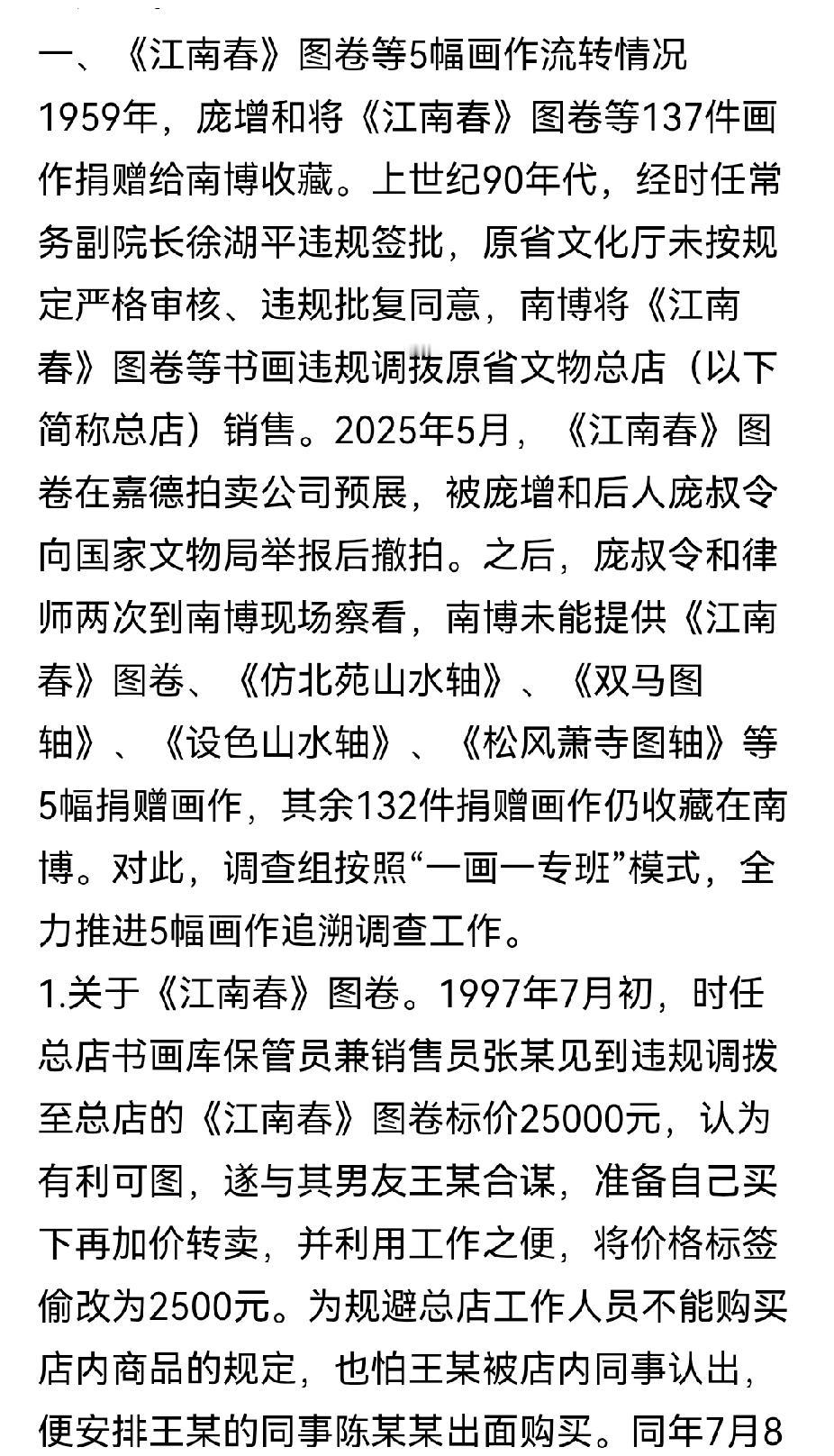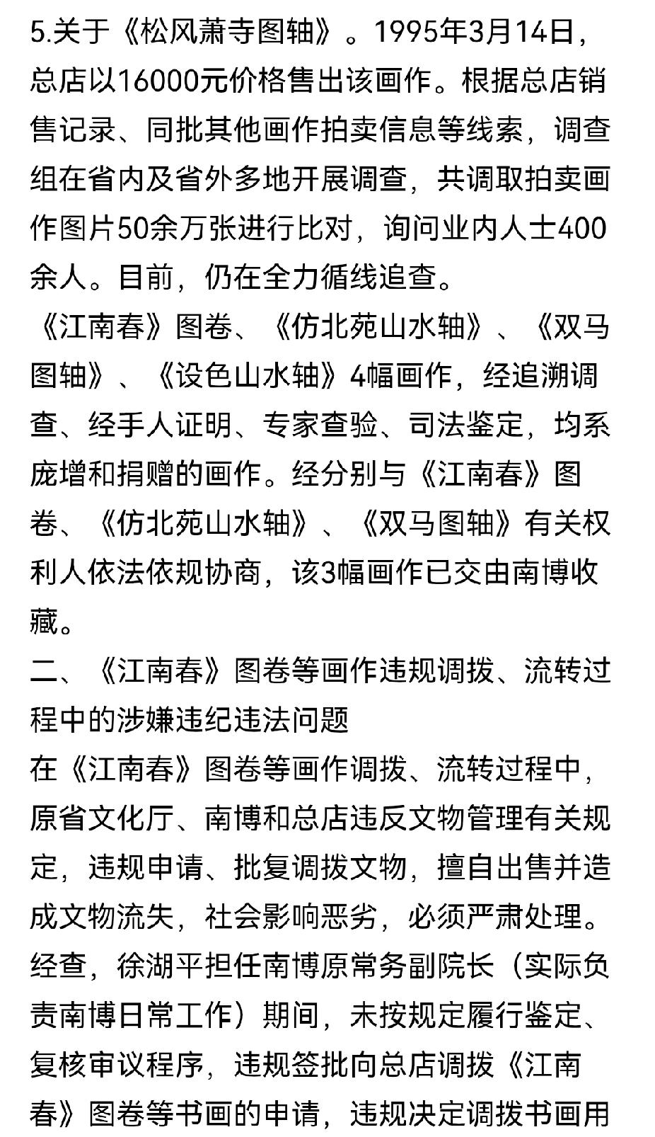 南京博物院《江南春》图卷调查结果出炉,有一个疑问:徐湖平违规调拨,他图啥? 根据调查结果,徐湖平违规调拨《江南春》等书画给江苏省文物总店,然后被一个仓库管理员修改价格,伙同男友买下后加价转卖,买家是南京艺兰斋的实控人陆挺。 那么问题来了,徐湖平曾经多次公开陆挺是他的好友。那么问题来了,《江南春》被徐湖平违规调拨到江苏省文物总店后,被仓库保管员里应外合以极低价格买下转卖,最终却到了徐湖平好友的手里,这也太巧合了吧。 就算这么巧合,难道陆挺不会告诉徐湖平吗?徐湖平知道了整个过程,却未对仓库保管员做出任何处罚,这也说不过去啊。 仓库保管员在《江南春》一事中到底起了什么角色呢,值得商量。