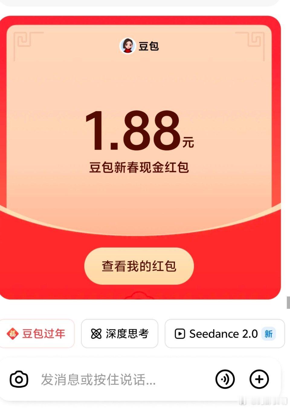 豆包红包还行,一个1.66,一个1.88,感谢可爱的豆包,新年快乐!