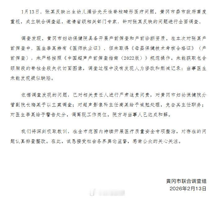 【湖北黄冈通报产检正常娃出生却畸形】2月13日,黄冈市联合调查组发布情况通报:
