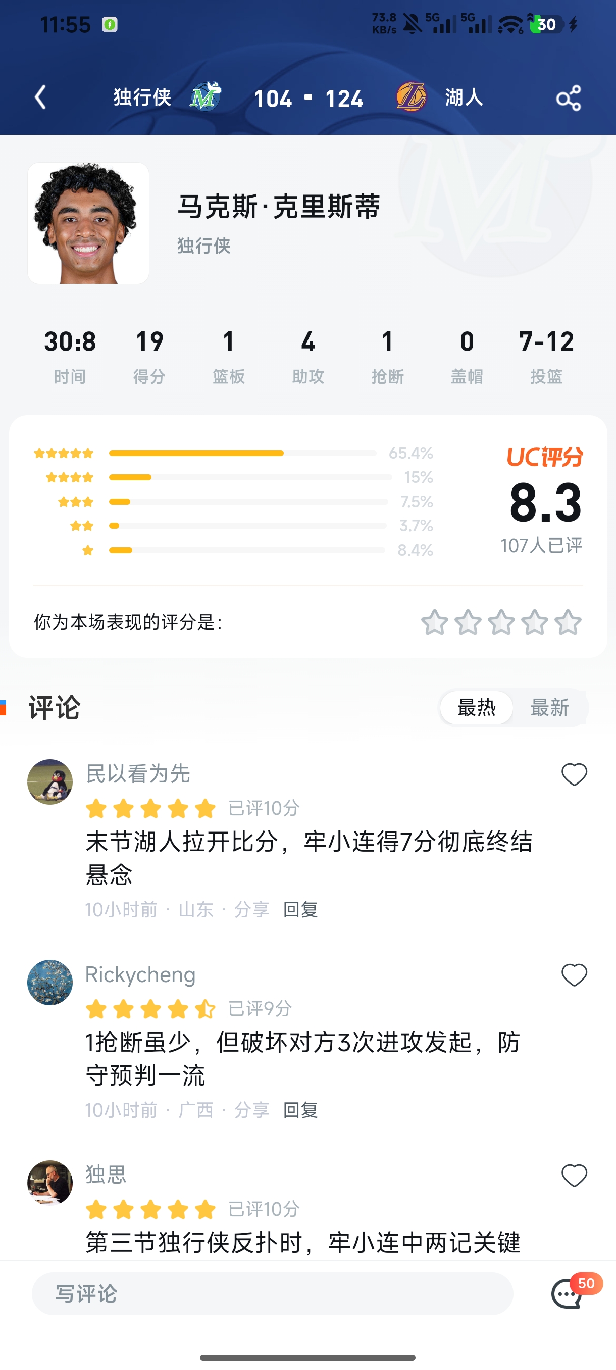 湖人这场大胜,除了老詹三双、海斯吃饼,还有一个隐藏功臣——马克斯·克里斯蒂。 全场30分钟,7投12中,19分4助攻1抢断,正负值肯定不低。 但数据不能体现的是:末节独行侠追分最猛的时候,是他连得7分,直接按住了对手的反扑势头。 UC评论区这条说得特别到位: @民以看为先: “末节湖人拉开比分,牢小连得7分彻底终结悬念”(还打了10分) 平时都叫他“牢小”,今天是真·“小科比”附体。107人评分8.3分,我觉得合理,甚至还能再高点。你们觉得呢?
