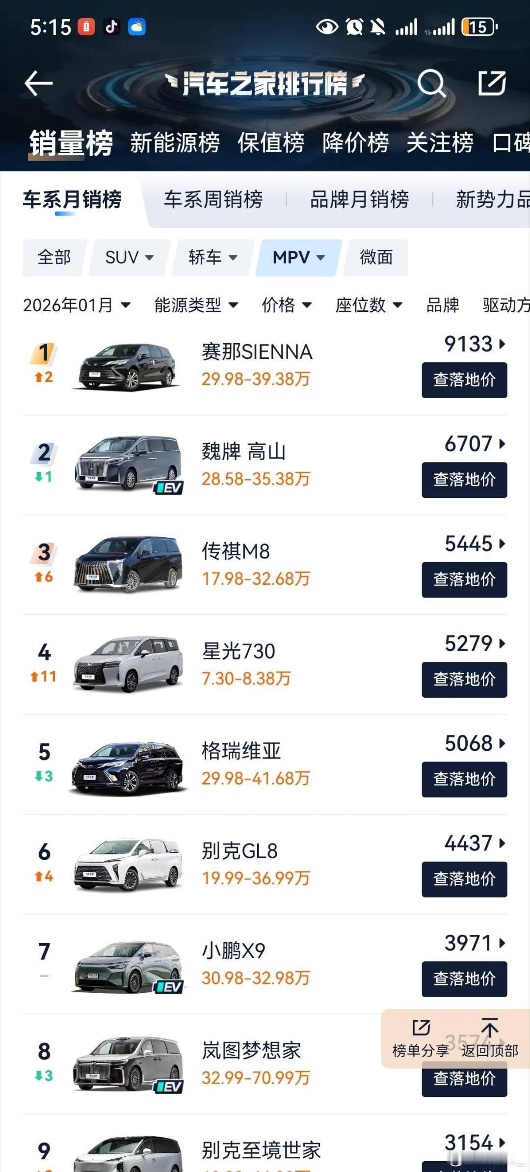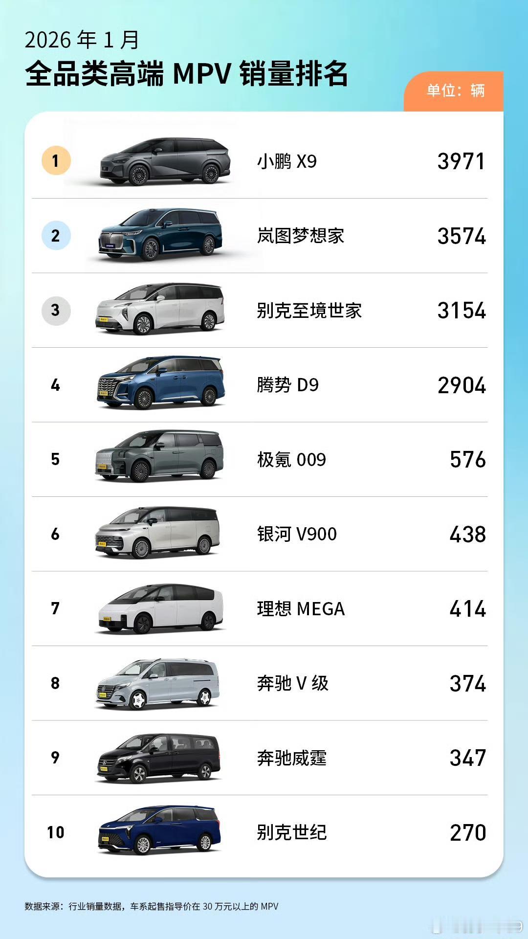 孙少军:小鹏X9 1月卖得不错! 但是翻看汽车之家非常专业的MPV类栏目,2026年1月份销量排行榜小鹏x9的排行是第七,卖的最好的是丰田塞纳,其次是魏牌的高山。 可能是定于不同,这个叫做2026年1月份全品类高端MPV。各位是怎么看的?欢迎评论区留言。