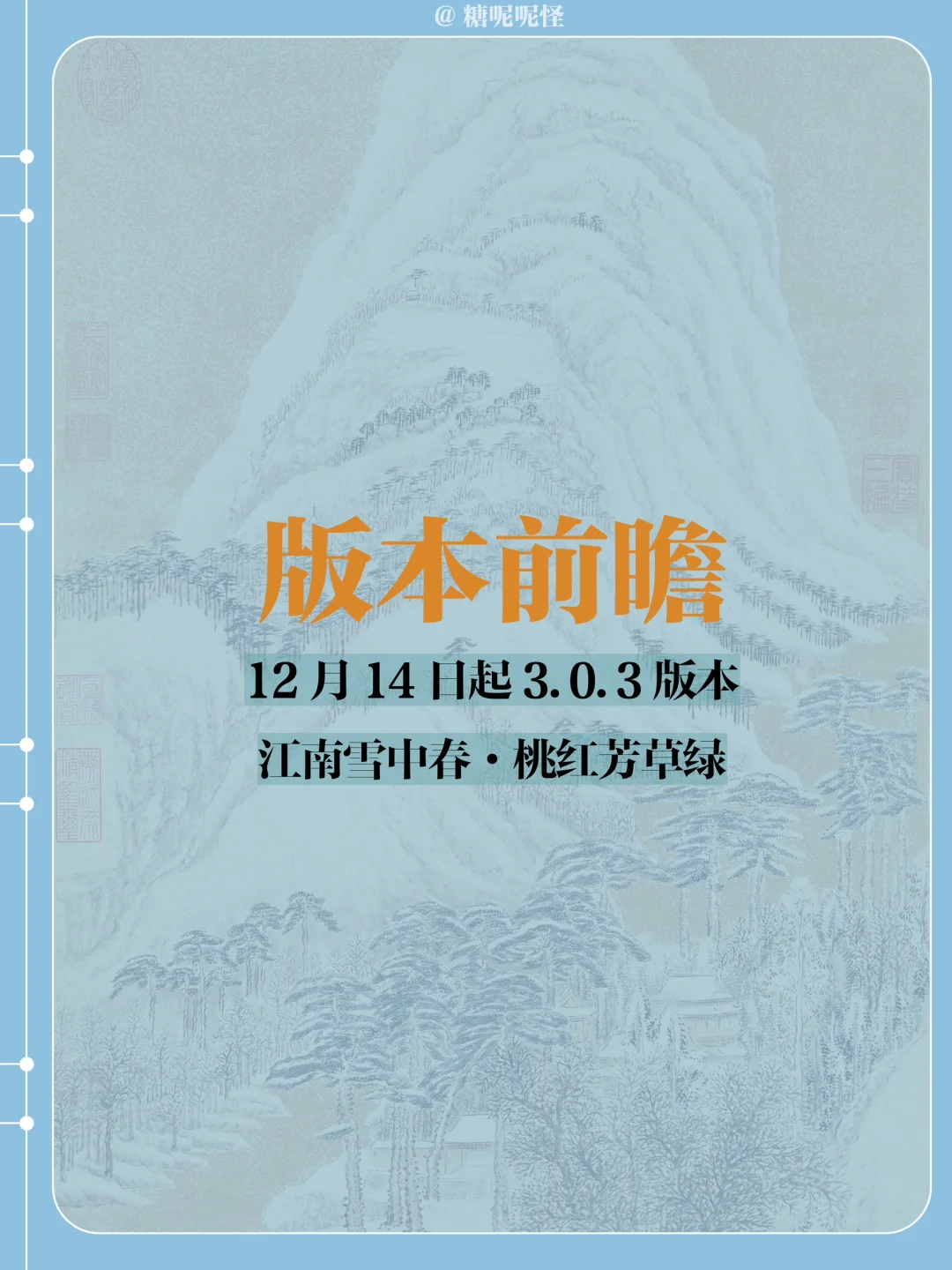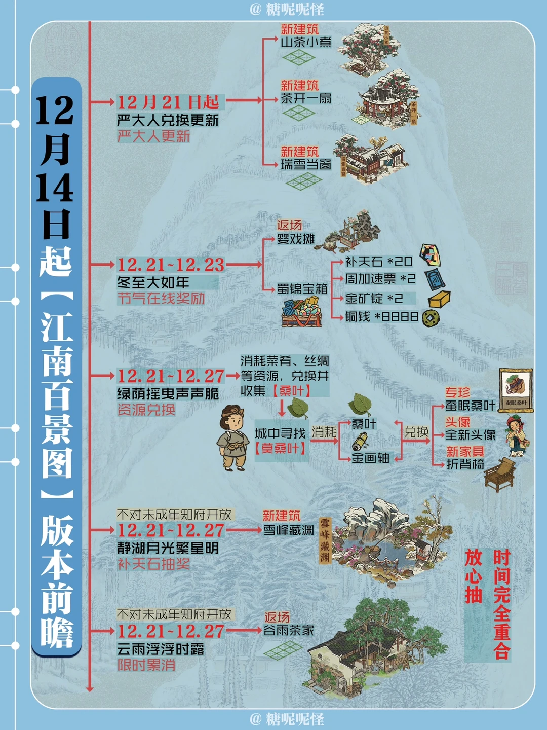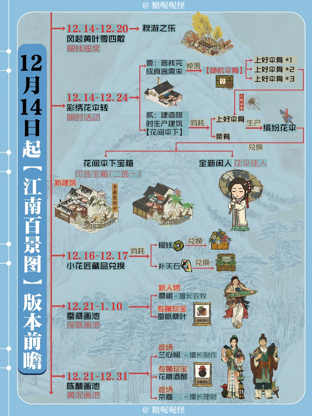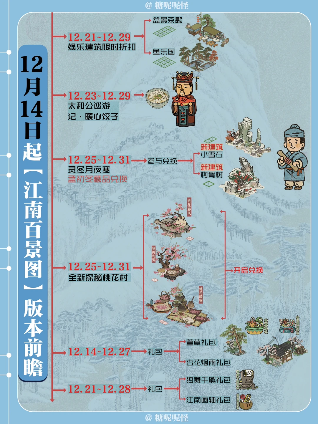 新版本前瞻+12月月中活动来啦,桃花村和严大人建筑占主要比重 新建筑:【茶开一扇】【山茶小煮】【瑞雪当窗】【雪峰藏渊】【冬藏花间伞】【小雪石】【枸骨树】【八珍馆】【猎人小屋】【莲花石灯】【桃花饮蜜】【桃花春风】【桃花酿蜜】【四方城】【折背椅】等。 新人物:【桑岷】+专珍【蚕眠桑叶】 返场建筑:【谷雨茶家】【花间伞下】【婴戏摊】【杏花酒家】【灵椿树】 返场人物:【兰心娴】+专珍【花雕酒坛】【荣嘉】