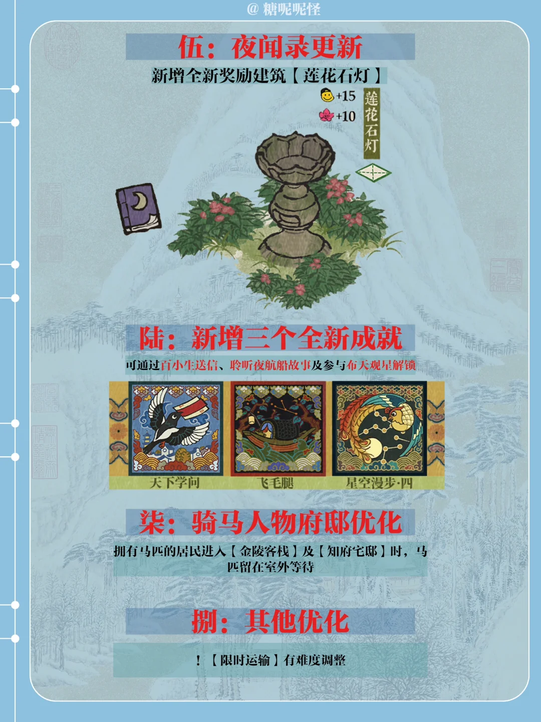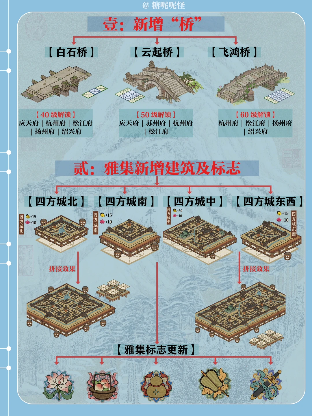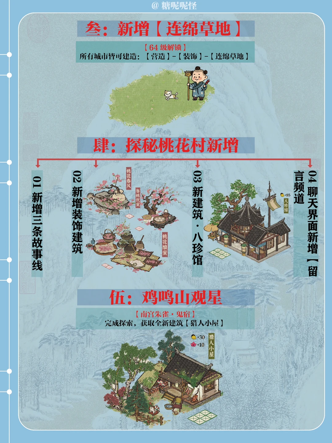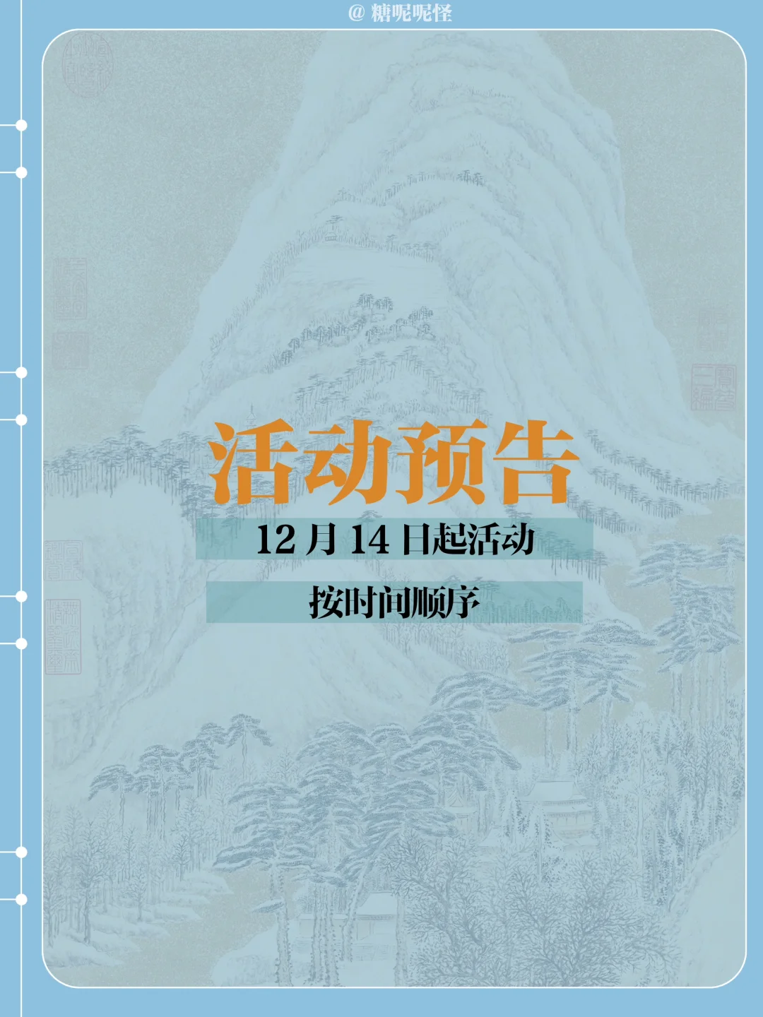 新版本前瞻+12月月中活动来啦,桃花村和严大人建筑占主要比重 新建筑:【茶开一扇】【山茶小煮】【瑞雪当窗】【雪峰藏渊】【冬藏花间伞】【小雪石】【枸骨树】【八珍馆】【猎人小屋】【莲花石灯】【桃花饮蜜】【桃花春风】【桃花酿蜜】【四方城】【折背椅】等。 新人物:【桑岷】+专珍【蚕眠桑叶】 返场建筑:【谷雨茶家】【花间伞下】【婴戏摊】【杏花酒家】【灵椿树】 返场人物:【兰心娴】+专珍【花雕酒坛】【荣嘉】
