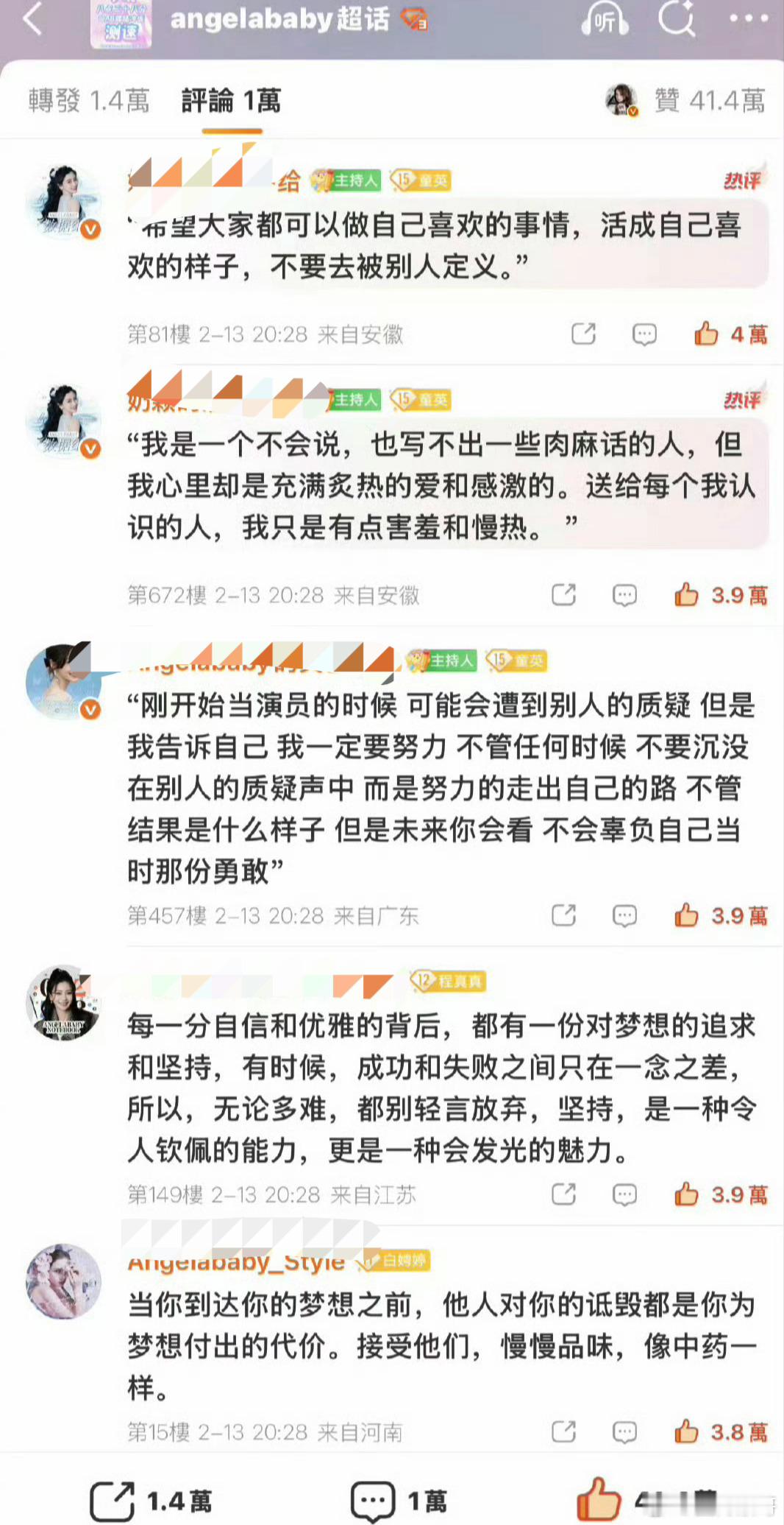 Angelababy活粉好多粘性也好高,粉丝测s十分钟内赞4w多总赞41.4w,目前1个小时已内赞过5万总赞已破55万!