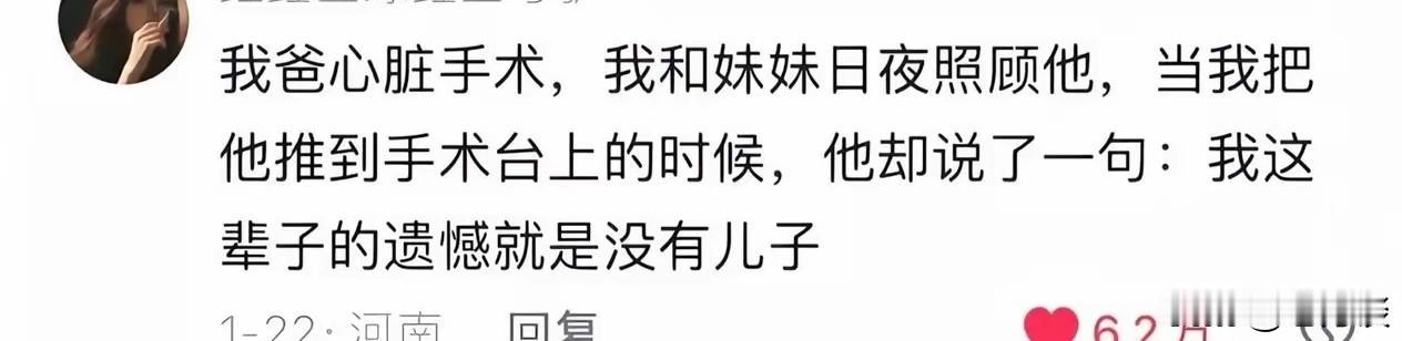 如果你日日夜夜照顾病床上的父亲,当送他上手术台的时候,他却说,我这辈子最大的遗憾就是没有儿子。作为女儿当你听到父亲这句发自内心悲伤的话时你会作何感想?鞍前马后伺候却换来如此的吐槽,谁能接受得了,没有感谢不要紧,但是却被最无视了。儿子也做不到前前后后的伺候,付出了真心,却收获了最冰凉的话语。儿子与女儿有什么区别,人一死脚一蹬,整个世界都跟你无关,何必在乎男女呢!在你活着的时候,能够给你力气就是最好的。