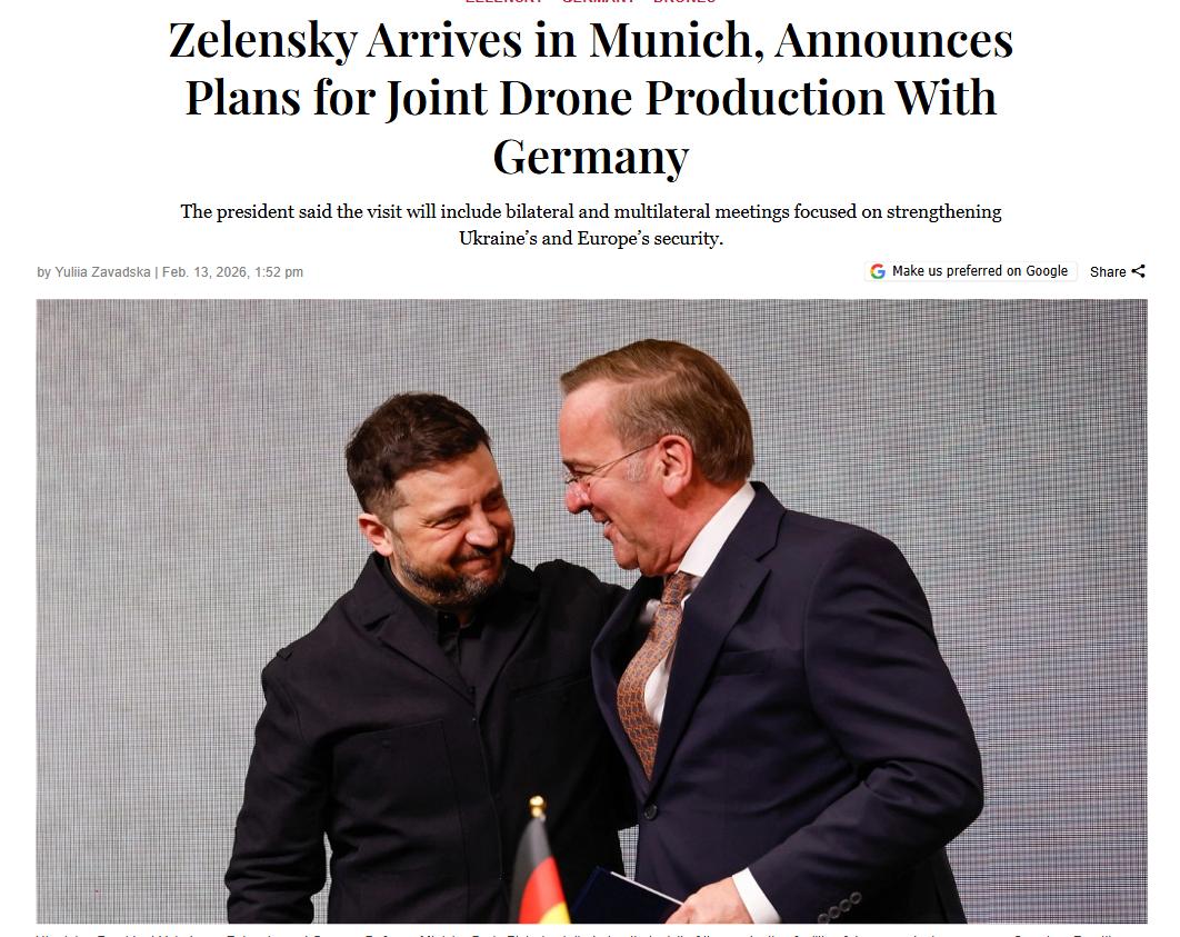 泽连斯基表示,他已抵达德国慕尼黑,参加高级别会议,重点讨论乌克兰与欧洲伙伴的安全与防务合作。泽连斯基于2月13日星期五发布的一篇帖子表示,此次访问将包括启动首个乌克兰-德国联合无人机生产企业的讨论,以及与合作伙伴进行双边和多边会谈。他强调需要扩大联合防御制造,加强协调,并强化欧洲的集体安全架构,并补充说,最终目标仍是以可靠的安全保障结束战争,保障乌克兰和欧洲。