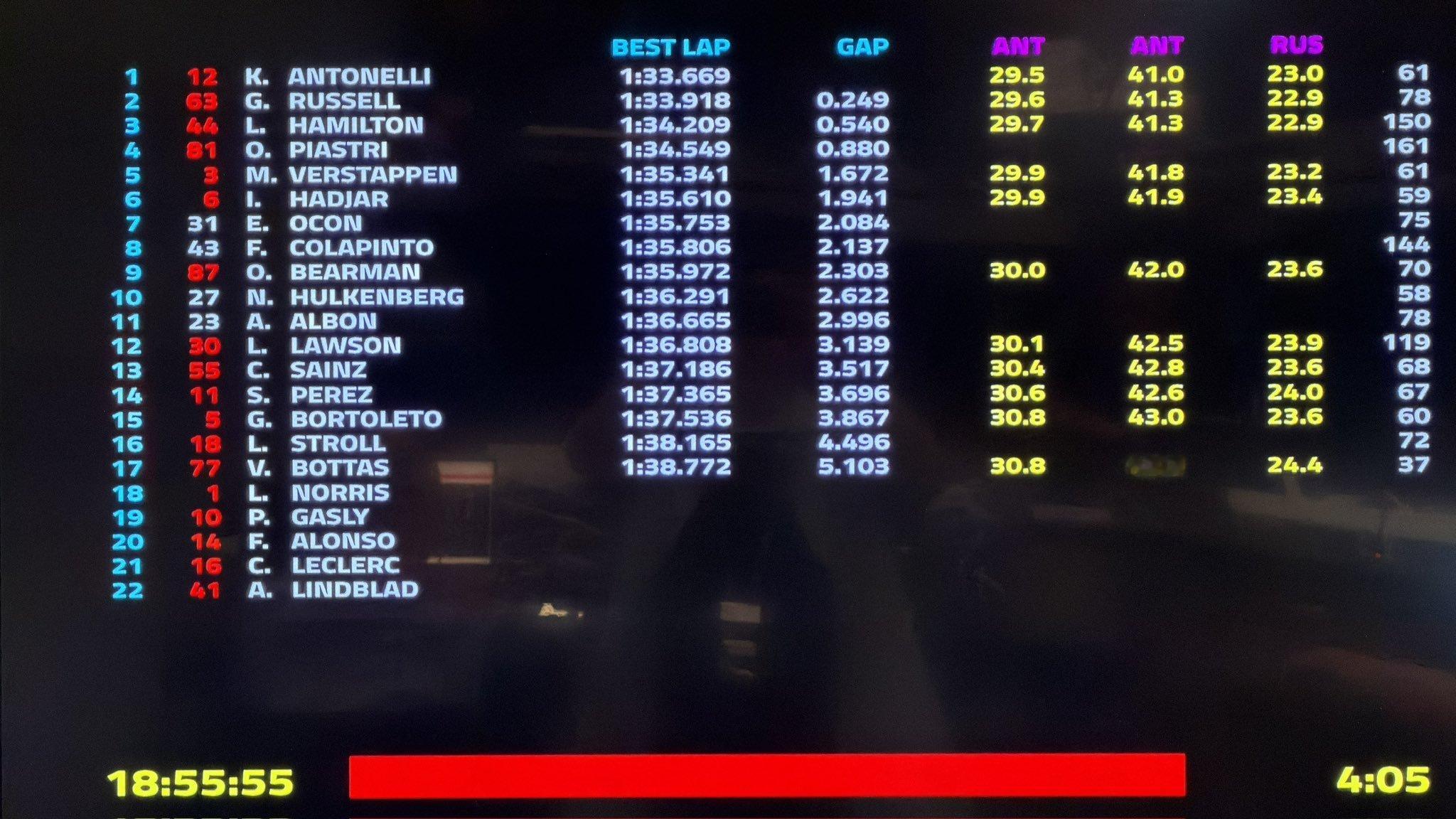 2026赛季F1巴林🇧🇭第一轮季前测试结束🔚梅赛德斯车队车手安东内利以1:33.669排在第一、队友拉塞尔以1:33.918排在第二,法拉利车队车手汉密尔顿以1:34.209排在第三……