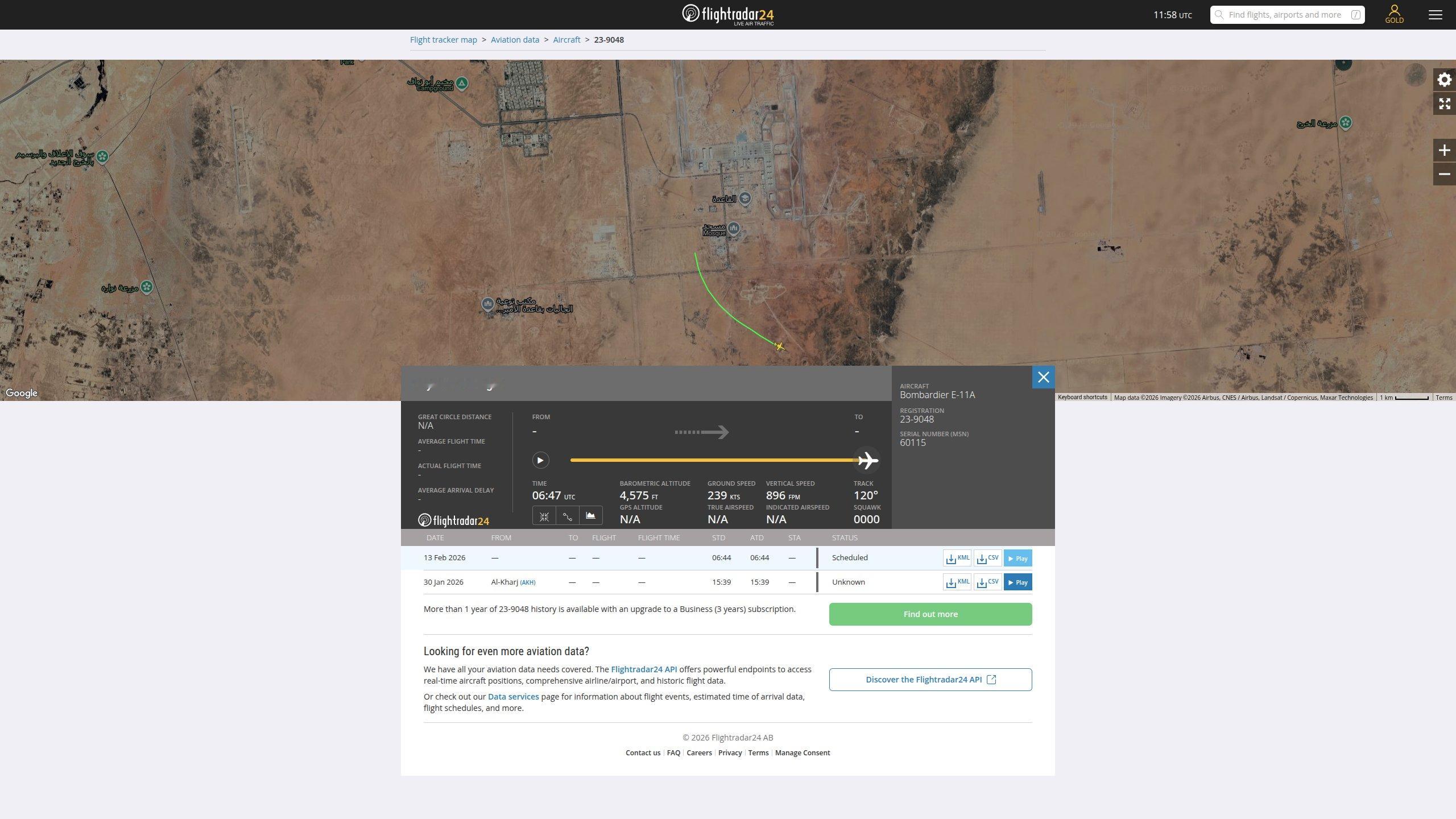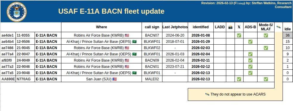 🔻E-11A BACN 机队(8 架);最后报告位置:2026-02-12➢ 23-9048 于 UTC 时间 6:45 从苏丹王子空军基地(OEPS)起飞 🇸🇦 ➢ 12-9506、23-9048 和 22-9047 已部署至 OEPS 🇸🇦 。➢ 也许正在进行轮换,或者是在为在伊朗展开行动做准备 🇮🇷 。🔻via SteffanWatkins 热点现场海外新鲜事全球最大航母驶向中东
