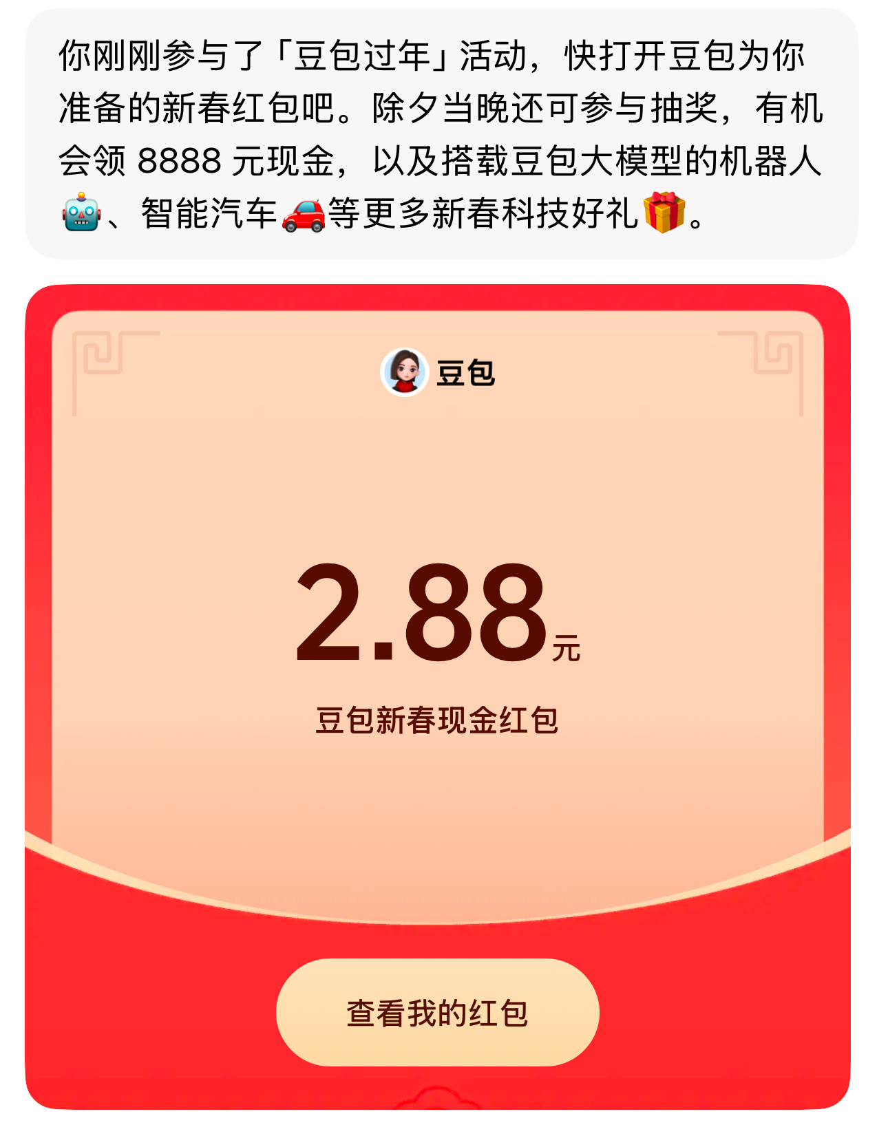 豆包红包豆包给了我三个关键词,还给了我2.88的红包,你不会比我更高了吧?热点观点 豆包红包