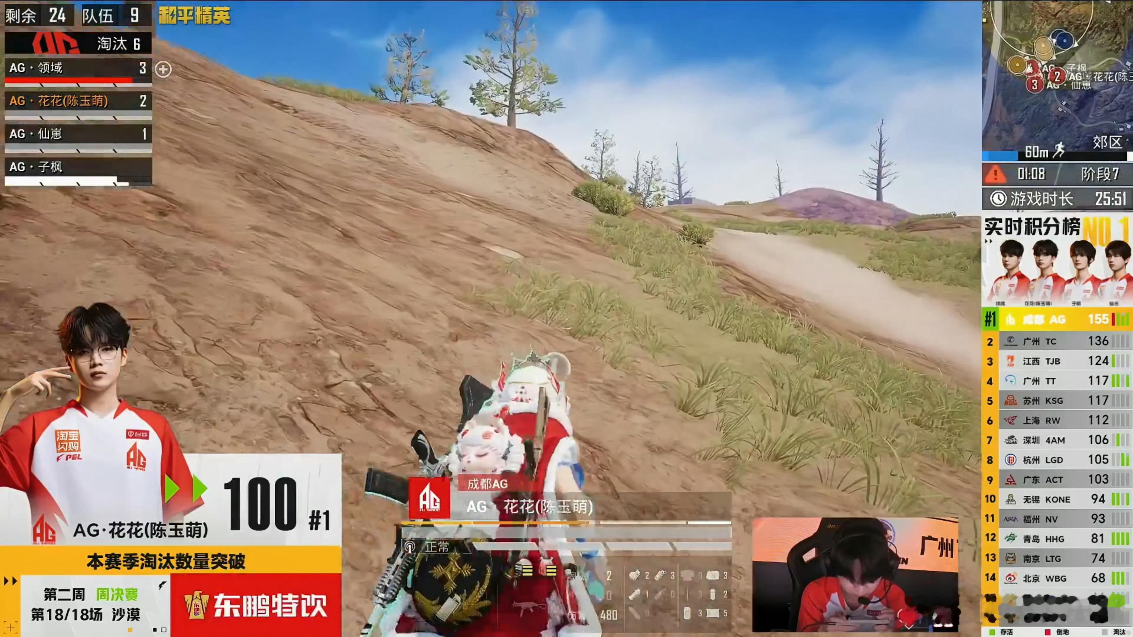 AG花花春季赛首位淘汰破百 ag蝉联周冠 花花成为PEL春季赛第一位淘汰赛破百的选手一共才打6天,真夸张。AG和平精英