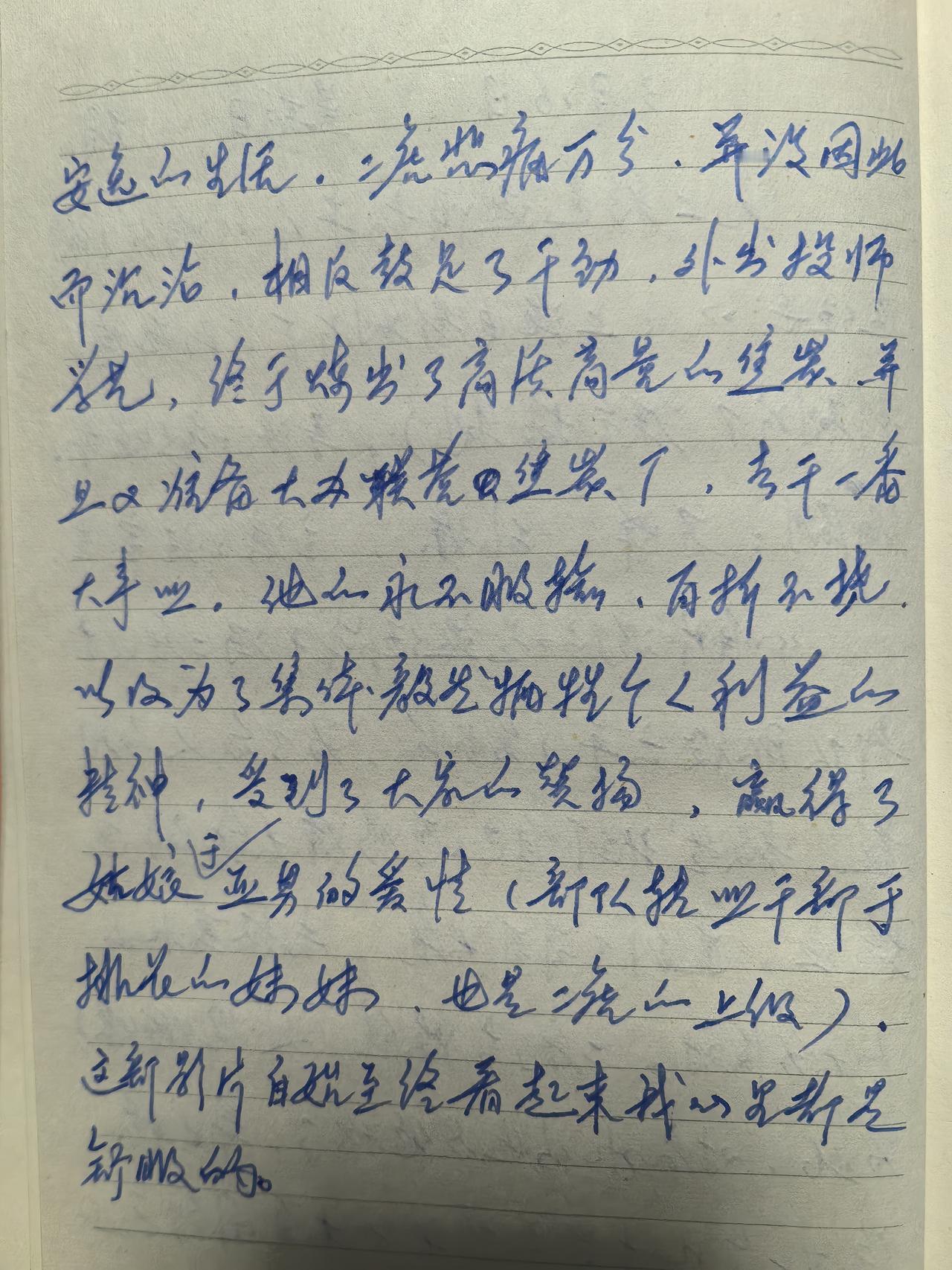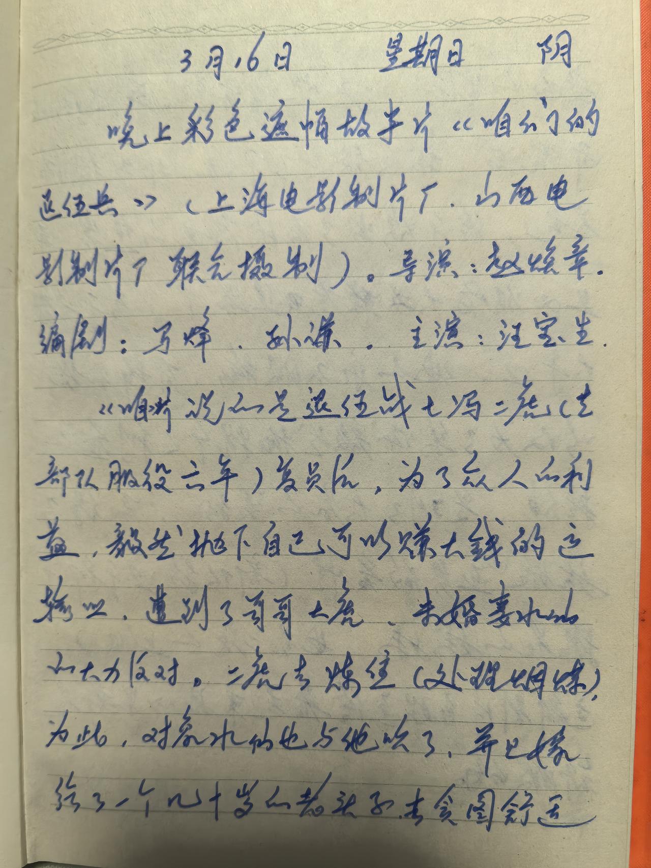 今天在《今日头条》上看到友友的一篇文章《咱们的退伍兵观后感》,颇为激动。 为什么呢?因为《咱们的退伍兵》这部影片对于我来说印象颇深。 那是1986年3月16日在部队的西安有线电通信技术学校读书的时候,由学校统一组织学员队的学员们在学校大门外的操场上观看这部影片的。 观影结束后,学员们统一列队回到宿舍。因为只要到熄灯时间,必须关灯摸黑,不得随意走动。 我当时在回到宿舍急匆匆地洗漱后,趴在上铺赶在熄灯前匆匆忙忙地写下了观后感,时间紧凑,笔记潦草,但是大致上还是能看出当年的痕迹的。 今天在这里展示给各位友友,看看自己四十年前的心路历程。 也有可能友友们会询问,你怎么记得那么清楚呢?呵呵,幸亏那个时候的日记本没有在多少次的搬家中丢失。 3月16日 星期日 阴 晚上彩色遮幅故事片《咱们的退伍兵》(上海电影制片厂、山西电影制片厂联合摄制)。导演:赵焕章,编剧:马峰、孙谦,主演:汪宝生。 《咱》片说的是退伍战士冯二虎(在部队服役6年)复员后,为了众人的利益,依然抛下自己可以赚大钱的运输业,遭到了哥哥大虎、未婚妻水仙的大力反对。二虎去炼焦(处理烟煤),为此对象水仙也与他吹了,并且嫁给了一个几十岁的老头子去贪图舒适安逸的生活,二虎悲痛万分,并没因此而沉沦。相反鼓足了干劲,外出投师学艺,终于炼出了高质、高量的焦炭。并且又准备大办联营焦炭厂,去干一番大事业。他的永不服输、百折不挠以及为了集体毅然牺牲个人利益的精神,受到了大家的赞扬,赢得了姑娘于亚男的爱情(部队转业干部于排长的妹妹,也是二虎的上级)。 这部影片自始至终看起来我心里都舒服的。 剧作者马峰、孙谦二人在山西是家喻户晓,《我们村里的年轻人》就是深受观众喜爱的影片。 我是山西人,对影片的一切一切感到那么的熟悉,那么热爱,那里的山山水水留下我幼年的回忆,像拉面、卡疙瘩(注,现在应该是掐咯斗)这种饭,令我想念我的家乡。看到家乡的房子,听着家乡的语言,怎能不思念生我养我的故乡呢? 我自己出门在外,就为的是为社会贡献自己的力量,一个人的生命是有限的,要在有限的生命里给社会留下点什么,这才是我的人生哲学。因此,虽然目前离开了自己的家乡,为了更多的人的幸福,忍受着思乡的苦痛,是值得的。