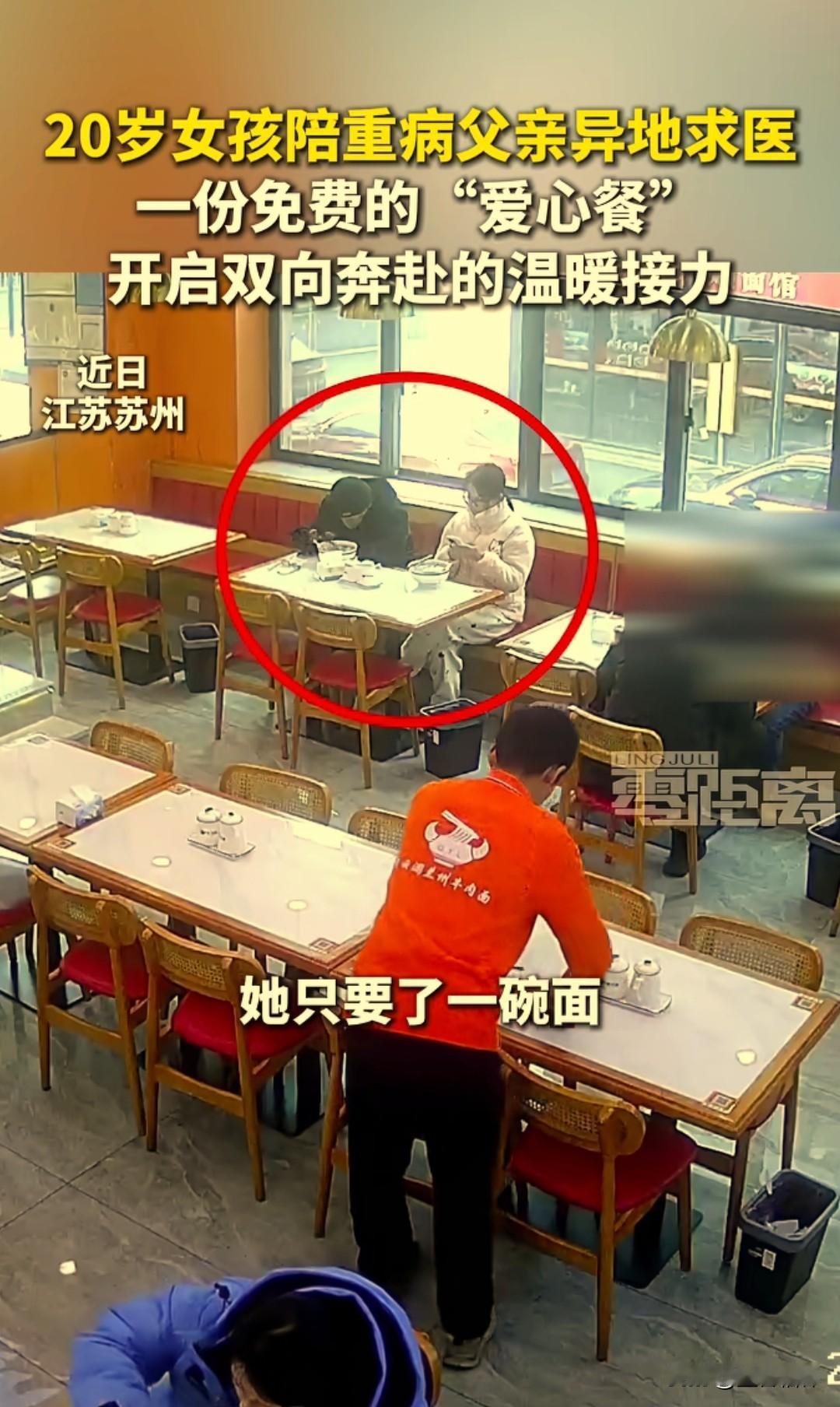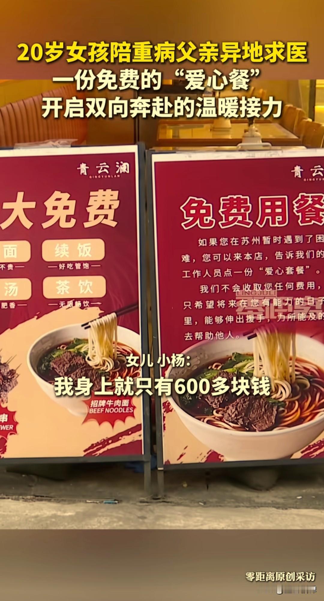 女孩带重病父亲求医,进店只点一碗面,老板悄悄塞来的饼温暖了整个苏州城 近日,在苏州姑苏区的一家兰州拉面馆内,上演了暖心一幕。20岁的女孩小杨,带着重病的父亲从外地来到苏州求医。由于治疗开销巨大,她身上只剩下600多元,生活陷入了困境。 给父亲看病积蓄几乎花光,住院的钱也是借的,为了省钱,两个人只点了一碗面,准备分着吃。面馆老板看在眼里,心想两个人怎么够吃,也没多说什么。 默默给他们多上了一碗,还加了一份肉,最后也没收钱,临走还将几个刚出炉的饼塞给女孩,嘱咐他们随时可以再来。 小杨也深受感动,她想报答老板,想做点什么,但目前没有能力。想到吃饭的时候看到店里的客流并不多,她便在网上发布了一条视频,为这家面馆免费“打广告”,希望能为老板增加一点热度。 据了解,面馆老板韩爱草来自青海,在苏州经营拉面馆已有多年,而且还长期参与公益活动,他的店本身就有“免费用餐”的公益项目。 在店门口牌子上写着:如果有人在苏州暂时遇到困难,可以来店里点一份“爱心套餐”,店家不会收取任何费用,只希望受助者将来有能力时,也能伸出援手帮助他人。 面馆老板的帮助是无声体贴的,他不仅加了免费的面,还悄悄地塞了饼,这个细节维护了女孩子自尊,让她没有心理负担,这种“润物细无声”的善良,比单纯的施舍更可贵。 苏州的冬天是湿冷刺骨的,但是老板的举动对于身心俱疲的小杨来说是温暖的。苏州是座温暖的城市,它不仅有小桥流水的精致,更有包容友善的胸怀。 正因为有无数这样默默无闻的善举,才构成了这座城市最真实、最温暖的底色。为善良的老板点赞,也祝愿小杨的父亲能早日康复!