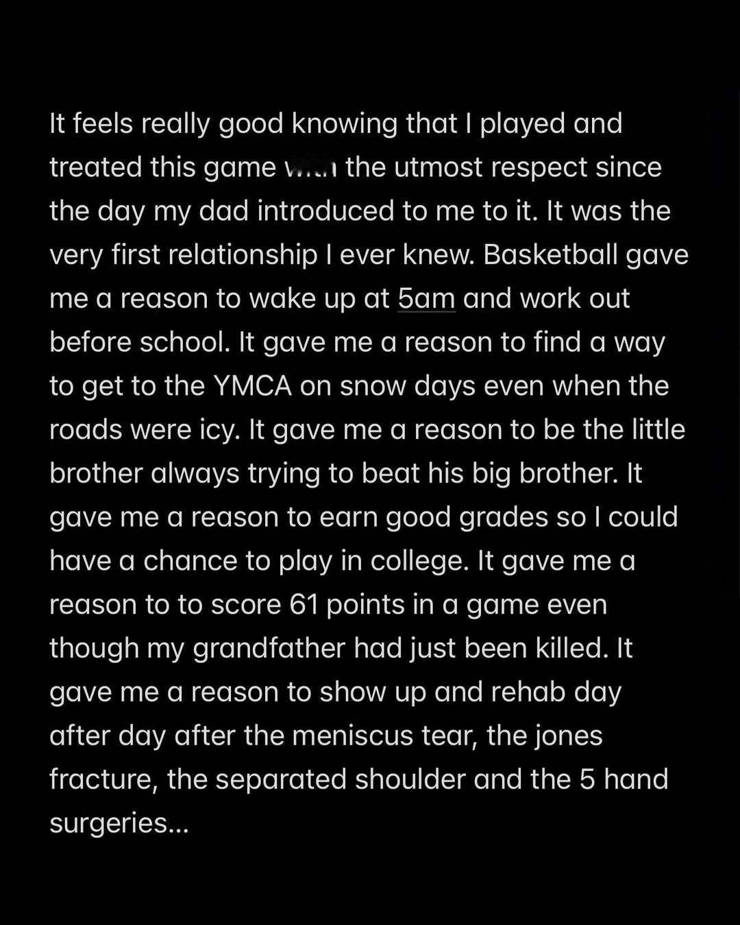 从父亲带我接触篮球的那天起,我始终以最大的尊重对待这项运动,想到这一点,我就感到无比踏实。这是我人生中第一段关系。篮球给了我每天早上5点起床、在上学前训练的理由;给了我在下雪天、路面结冰时,也要想方设法去基督教青年会打球的理由;给了我作为弟弟,总想赢过哥哥的理由;给了我努力取得好成绩,只为获得大学打球机会的理由;给了我在祖父刚刚离世后,仍在一场比赛中砍下61分的理由;给了我在半月板撕裂、琼斯骨折、肩袖分离,以及经历5次手部手术后,日复一日坚持康复的理由……