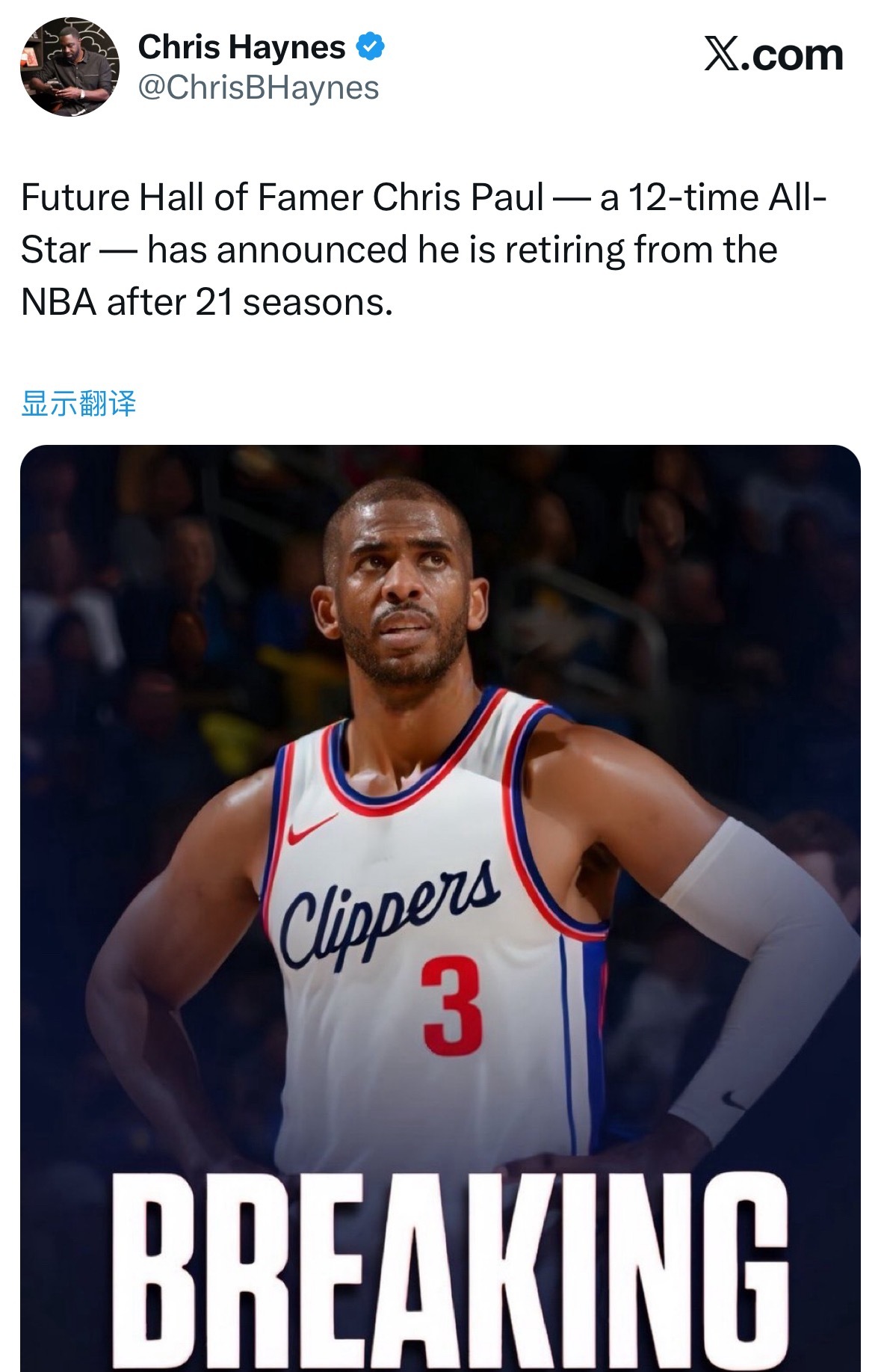 克里斯-保罗宣布退役,在其ins写到:就是这样了!在21年之后,我将正式告别篮球
