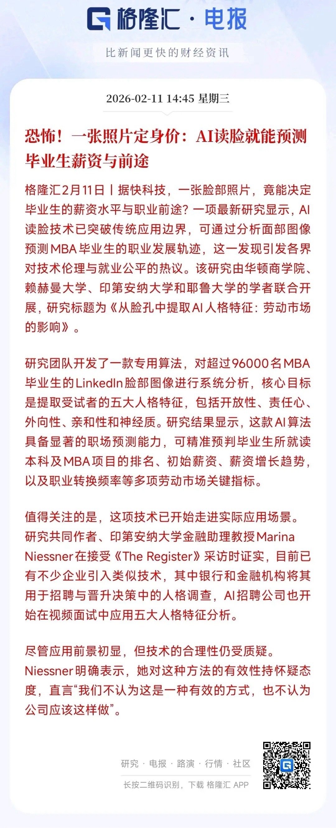 关键的是已经不少银行、金融公司、招聘平台,已经开始在招聘、升职、视频面试里用这种AI看脸判性格。