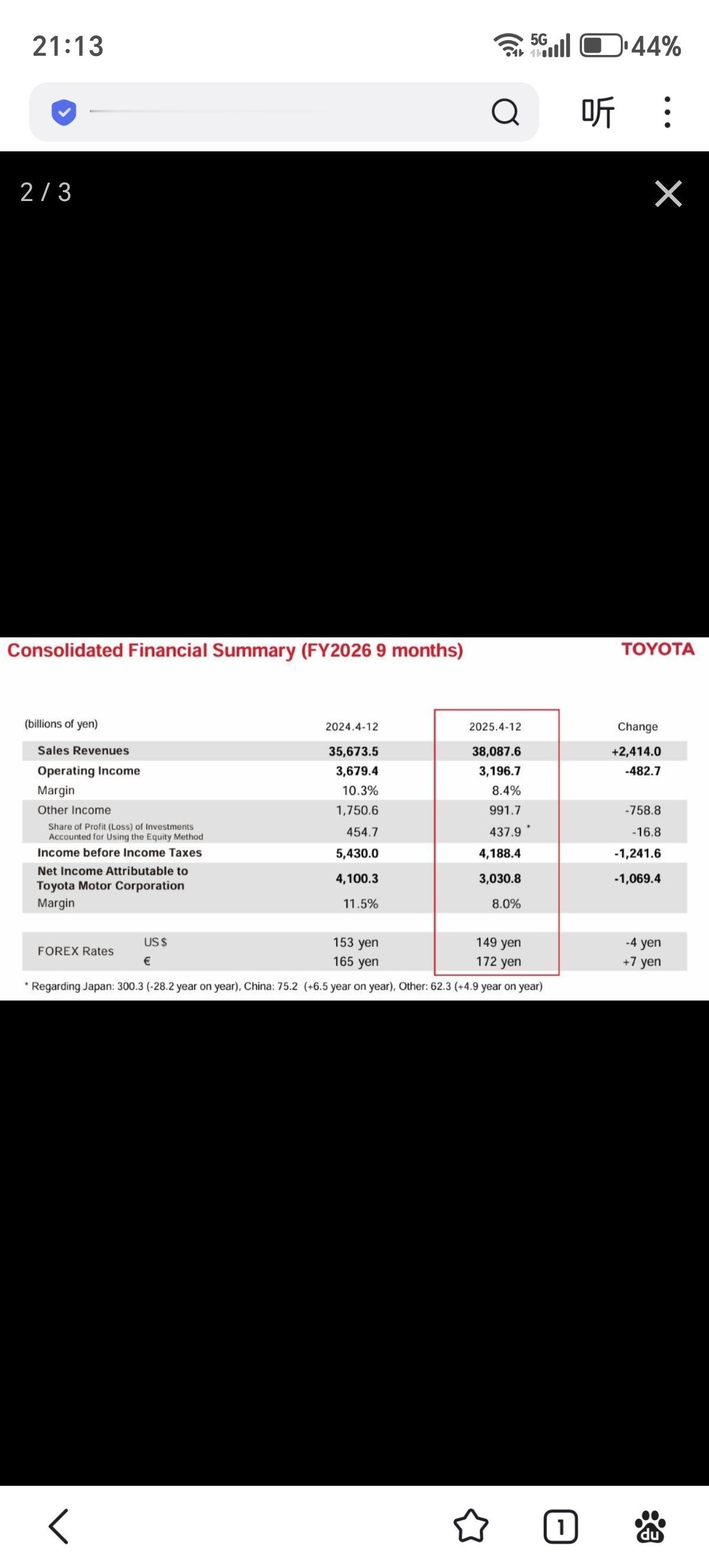 川普关税打爆丰田,丰田三季度利润腰斩 丰田在2026财年第三季度(2025年10-12月)的净利润为1.26万亿日元,较2025财年同期的2.19万亿日元减少0.93万亿日元,同比减少43%,几乎腰斩。 丰田在2026财年前三季度的净利润为3.03万亿日元,较2025财年同期的4.10万亿日元减少1.07万亿日元,同比下滑26.1%。 对于净利润下滑的原因,丰田在公告给出的理由主要为受到美国关税政策影响,带来的负面影响达1.2万亿日元。 注意从2020~2025仅5年时间,东大市场上的日本品牌车销量就暴跌200万台,但丰田的销量仅微幅下降!丰田的“好日子”还在后头呢 不仅仅是东大市场,东大新能源车正在全球除美国、日本以外的市场疯狂抢日系车的份额,叠加川普增加的关税,日系车的好日子已经完结了