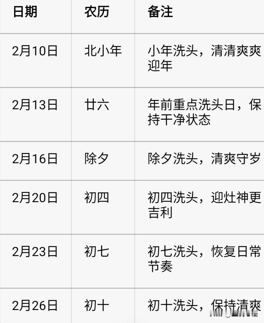 马年洗头计划表,长辈们看了超喜欢! 宝子们,新年洗头时间表来啦! 按这个洗,清爽又讨喜~ 小年、廿六、除夕必洗,从头干净迎新年。初四迎灶神、初七收心、初十日常,这几天洗都超合适。 重点记牢:初一初三别洗头,干性发质用干发喷雾应急就好。洗完记得涂护发素,别过度清洁,头发顺顺的才好看~ 新年从头顺到尾,跟着计划表洗就对了!