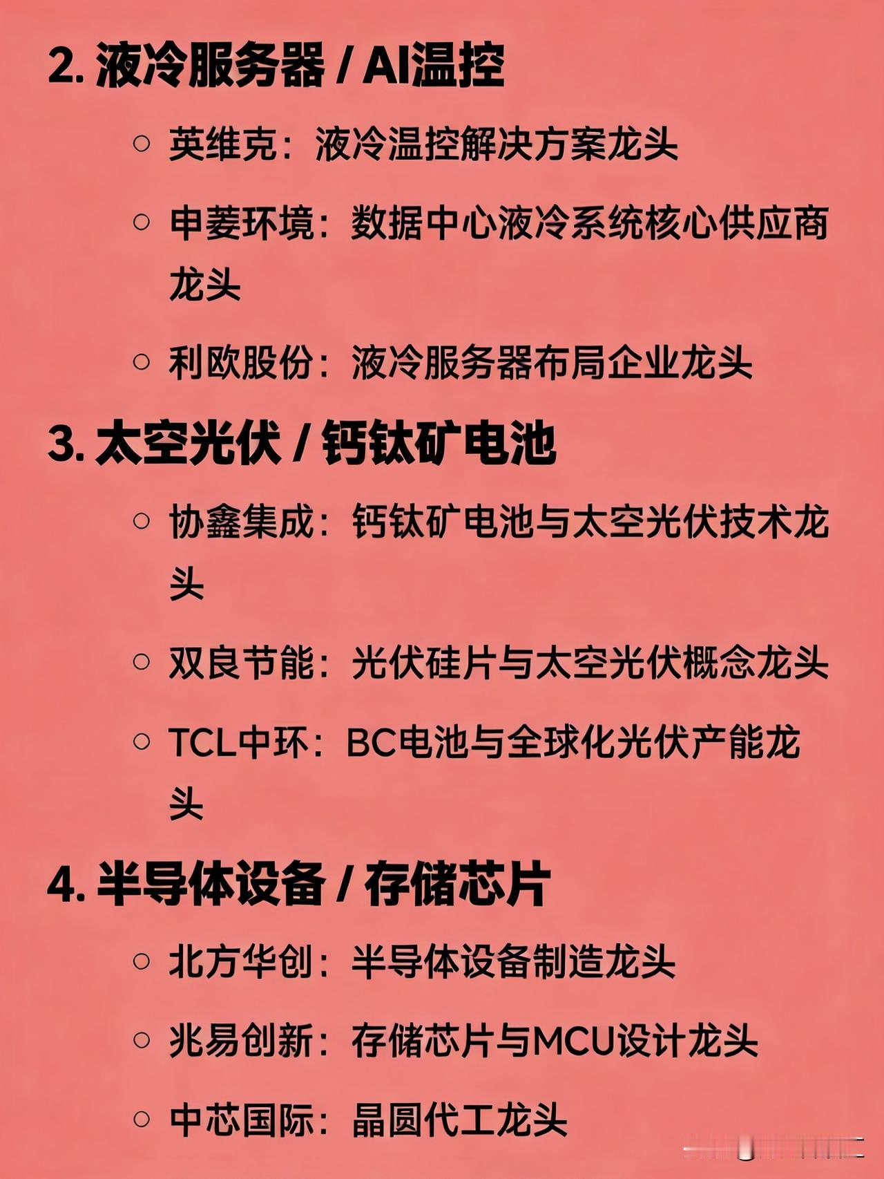 2026年2月14日,本周十大热点概念(热门科技龙头) AI算力 / 算力基建 大位科技:算力租赁与东数西算工程参与龙头 网宿科技:边缘计算与算力服务龙头 首都在线:智算云与算力基础设施服务商龙头 中际旭创:光模块与算力互联核心龙头 特发信息:F5G与光纤光缆龙头 液冷服务器 / AI温控 英维克:液冷温控解决方案龙头 申菱环境:数据中心液冷系统核心供应商龙头 利欧股份:液冷服务器布局企业龙头 太空光伏 / 钙钛矿电池 协鑫集成:钙钛矿电池与太空光伏技术龙头 双良节能:光伏硅片与太空光伏概念龙头 TCL中环:BC电池与全球化光伏产能龙头 半导体设备 / 存储芯片 北方华创:半导体设备制造龙头 兆易创新:存储芯片与MCU设计龙头 中芯国际:晶圆代工龙头 沪硅产业:半导体大硅片龙头 军工装备 / 军民融合 航发动力:航空发动机总装龙头 中航沈飞:战机整机制造龙头 亚星锚链:海工与军工船舶配套龙头 AI内容审核 / 数字安全 人民网:AI内容审核与主流媒体平台龙头 汉邦高科:视频AI审核技术龙头 三六零:网络安全与AI大模型应用龙头 AI短剧 / 数字内容 / IP运营 掌阅科技:AI语料与数字阅读平台龙头 中文在线:IP运营与AIGC内容生态龙头 捷成股份:新媒体版权与AI视频内容龙头 商业航天 / 海工装备 中国卫星:卫星制造龙头 航天电子:宇航电子系统龙头 巨力索具:航天配套结构件供应商龙头 氟化工 / 固态电池材料 多氟多:氟化工与电解质材料龙头 天际股份:六氟磷酸锂与固态电池材料龙头 低空经济 / 无人机 / 通航制造 亿航智能:工业无人机与低空飞行器龙头 中信海直:通航运营与低空服务龙头 四川九洲:低空通信与空管系统龙头