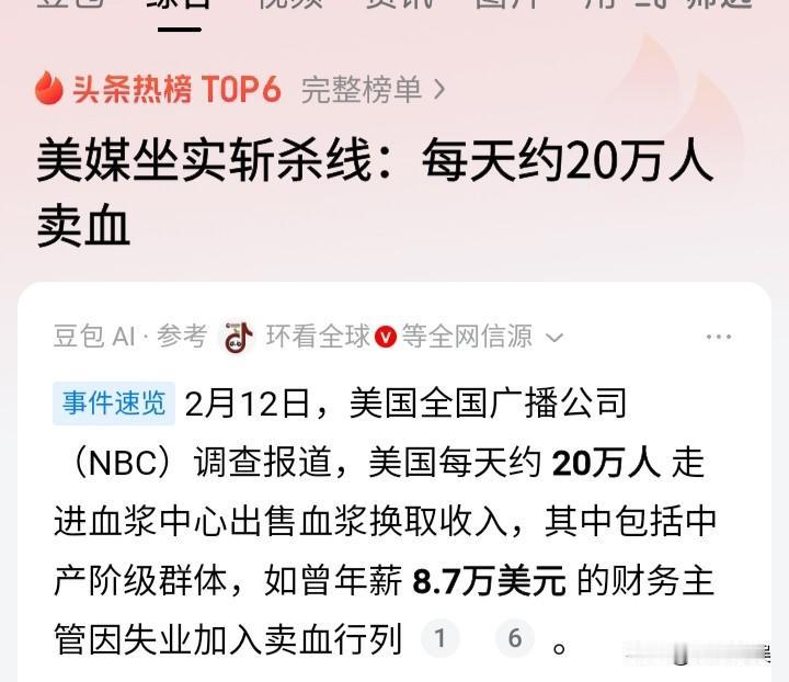 美国广播公司的这条新闻, 直接堵住了某些人的嘴了, 这下他们可能没法反驳了。 以前牢A爆出来老美的斩杀线的时候,一些人就出来反驳牢A说他是胡说八道,还有要起诉牢A的。 直到美国广播公司的这一条新闻,世界安静了!终于堵住了他们的嘴了。 美国广播公司报道老美每天有20万人需要靠卖血卫生,直接坐实了老美的斩杀线。