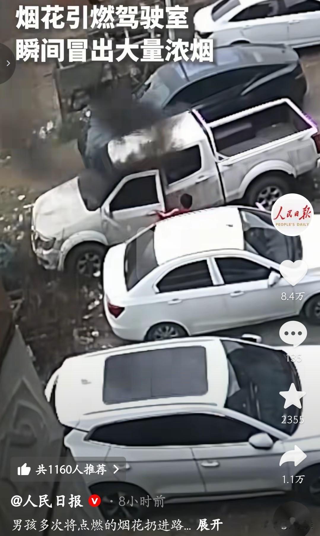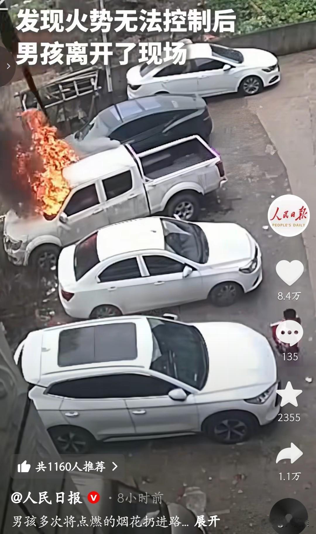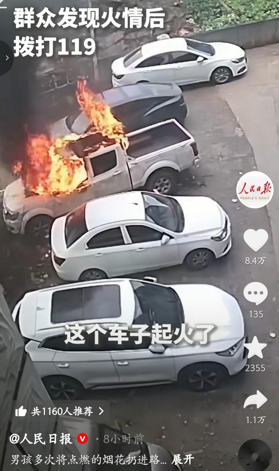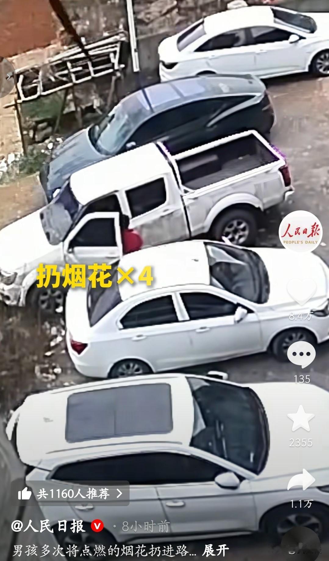 红衣服小男孩春节前真是给父母送了一份“大礼”啊!近日湖南,监控拍下惊险一幕。这名男孩多次将点燃的烟花,精准扔进路边车辆的驾驶室内。 从第一次尝试到连续四次投掷,男孩动作熟练,丝毫没意识到危险。没过多久,被扔进烟花的车辆驾驶室率先冒烟,紧接着明火窜出,火势迅速蔓延。发现控制不住火情后,男孩淡定转身离开现场。 周边群众发现火情后,立刻拨打119报警。消防员赶到后迅速扑灭火焰,但此次火灾已造成3台车辆不同程度受损。 这三台车辆的维修费用可不是小数目,被烟花直接引燃的那台皮卡,驾驶室和发动机舱基本报废,就算能修,费用也得好几万。旁边两台被火势波及的车,车身和内饰也有不同程度的熏烤和损坏,维修下来也得花不少钱。红衣服男孩的父母估计要哭晕了!