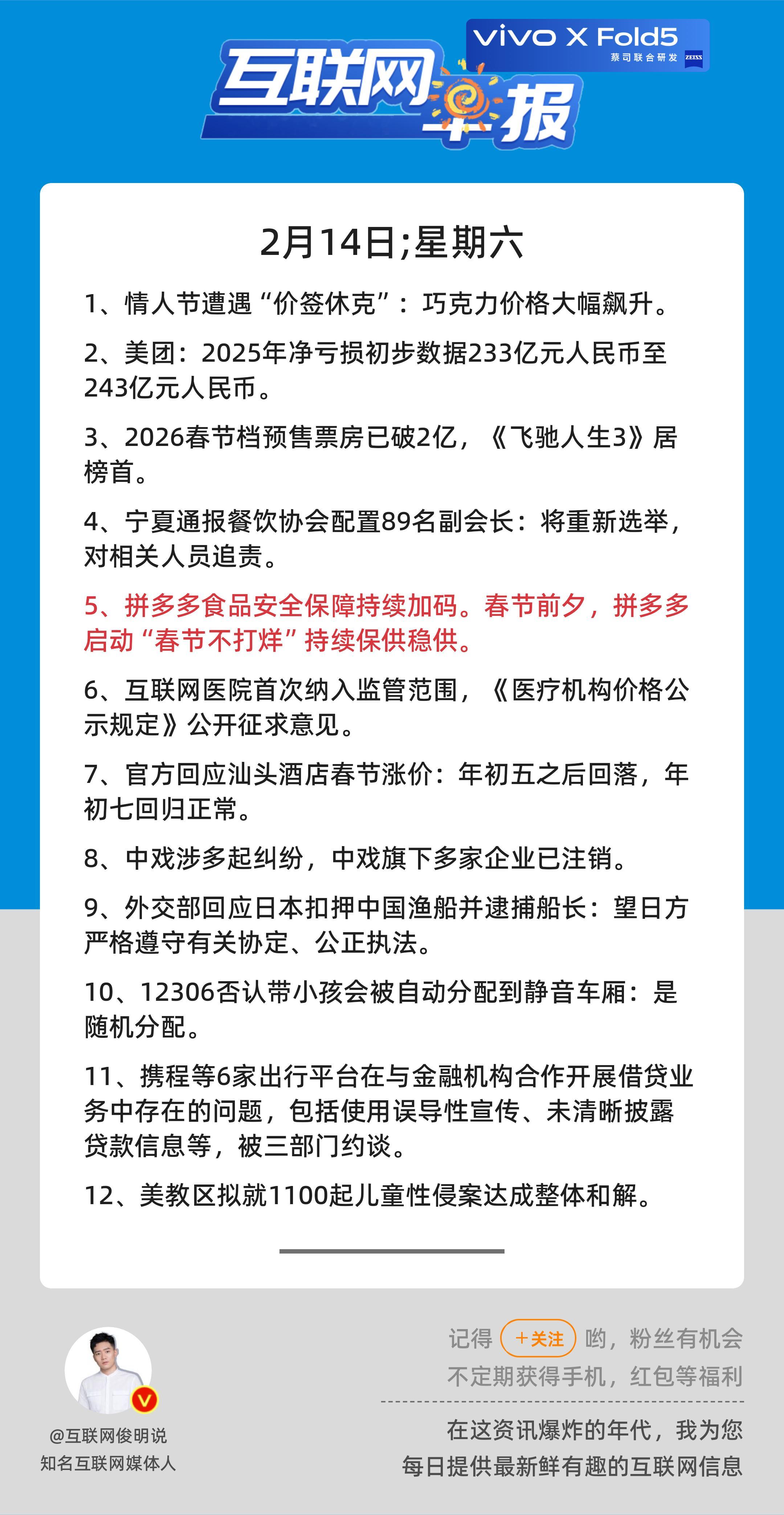 2月14日,星期六,《第3049期》;互联网早报,众览天下事关心第5条:拼多多食品安全保障持续加码。春节前夕,拼多多启动“春节不打烊”持续保供稳供;早安————————————点击右上方关注每天一分钟众览天下事,互联网早报值得拥有! 更多精彩,欢迎加入粉丝群俊明和他的朋友们