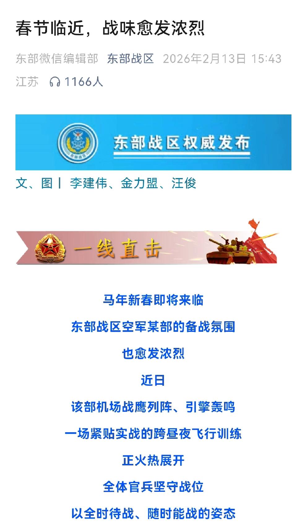 东部战区一条含义明确的迎春新闻:公众号告诉大家春节期间战区要干什么:备战打仗,春节临近,战味愈发浓烈。这是为什么?原因自己就是因为这个:台海巡部门宣称,将于春节期间开展所谓“安全维护工作”,动员各式舰船艇预置应处大陆灰色地带“侵扰”。 这就是告诉对岸,你试试看!