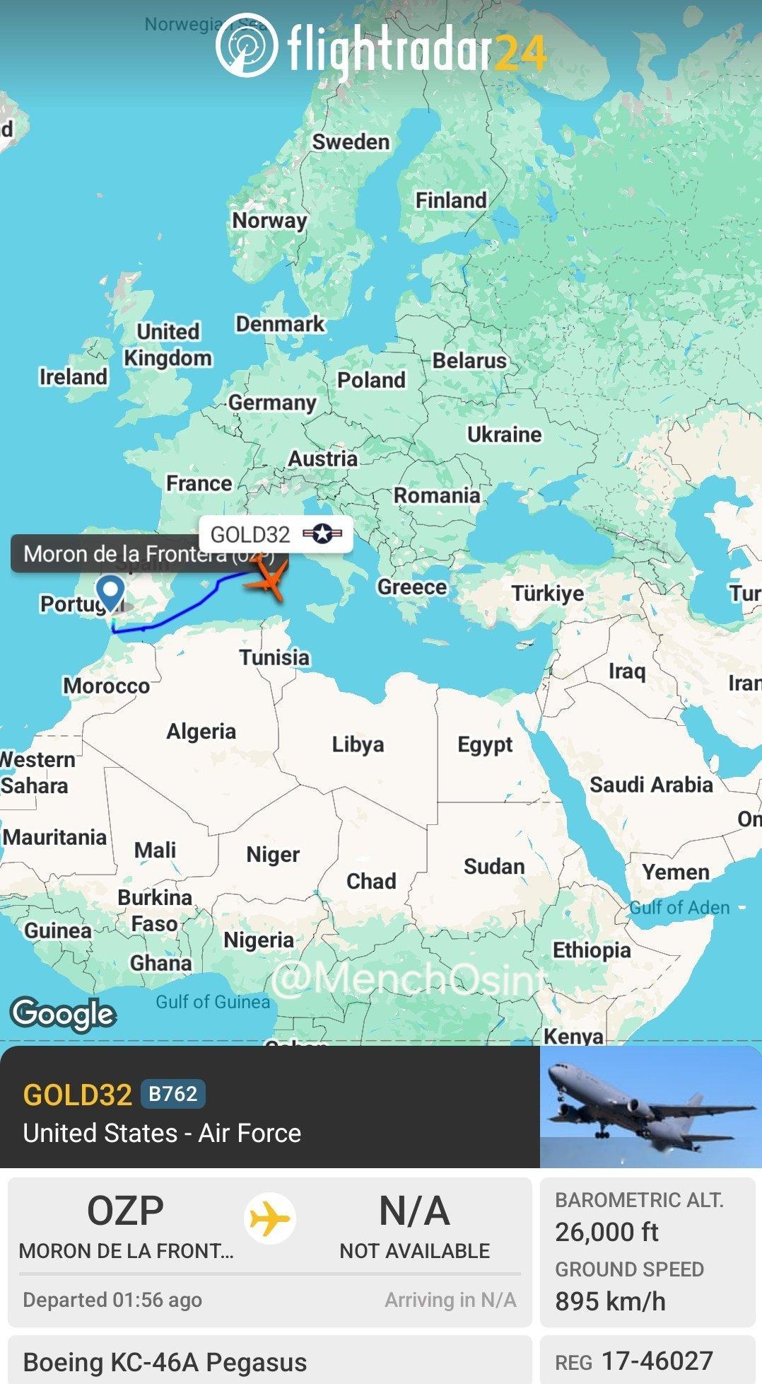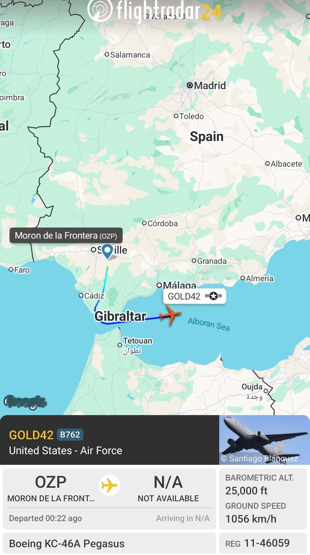 🔻KC-46A 加油机从西班牙莫龙空军基地起飞,可能是在伴随剩余的两架 EA-18G“咆哮者”、F-35 或者 F-15 向中东飞行。🔻via F24🔻就之前爆胎阻塞跑道的西班牙莫龙空军基地。热点现场海外新鲜事全球最大航母驶向中东
