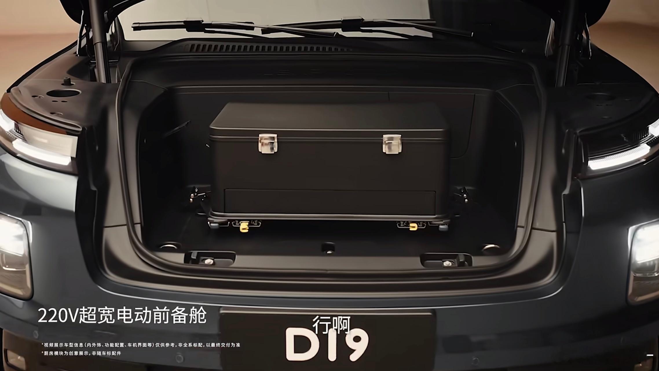 零跑D19的前备箱在结构优势之外,又引入了220V电源,这好比给工作台通了电,有电那就是强啊,可以做菜、煮茶磨咖啡甚至还能体验一把出摊。