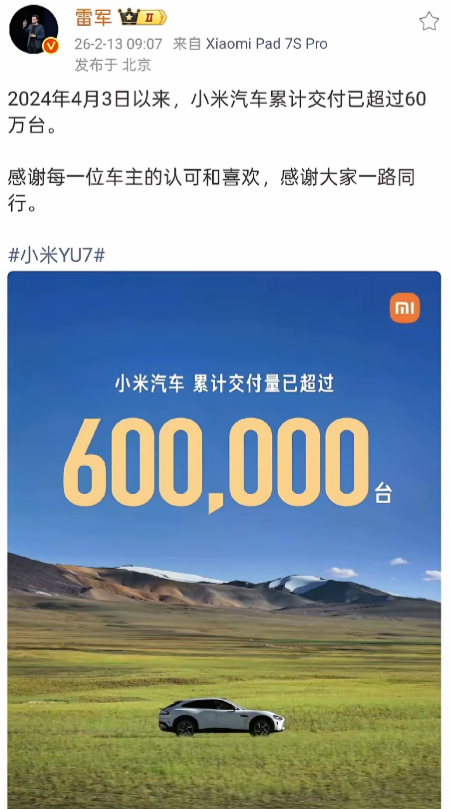 小米汽车自2024年4月3日首款SU7交付至今,仅用22个月突破60万辆,创下全球新能源车企0→60万交付最快纪录。 一.各车型数据 1.初代SU7:累计交付38.1万辆,2025年20万+纯电轿车销量第一。 2.YU7:上市6个月交付15万+,是SU7同期的2.3倍 - 2025全年:交付41万辆,超额完成30万目标。 - 2026年1月:淡季+SU7停产,仍交付3.9万辆。 - 盈利:2025上半年单季盈利,新势力最快盈利之一。 二、为何这么快 1.定位精准:SU7/YU7主打20-30万主流区间,占新能源市场40%+份额。 2.效率打法:轻资产代工+复用手机供应链,电池成本比行业低15-20%。 3.产能拉满:北京工厂双班制,产能利用率近200%。 4.生态协同:人车家全生态+MIUI车机,形成差异化壁垒。 三.对行业影响 1.新势力洗牌:速度+盈利双杀,倒逼同行降本提效 2.特斯拉承压:SU7超Model 3,YU7挤下Model Y,中国市场份额此消彼长 3.跨界范式:证明消费电子巨头跨界造车可行,效率优先成新标杆 四.风险与隐忧 - 产品迭代阵痛:SU7停产、新SU7未上,单靠YU7扛量 - 安全与口碑:曾有智驾事故争议,高速增长下质量管控压力大 - 产能与供应链:60万后冲百万,电池/芯片保供与品控是关键 - 竞争加剧:20-30万区间价格战更激烈,利润空间被压缩