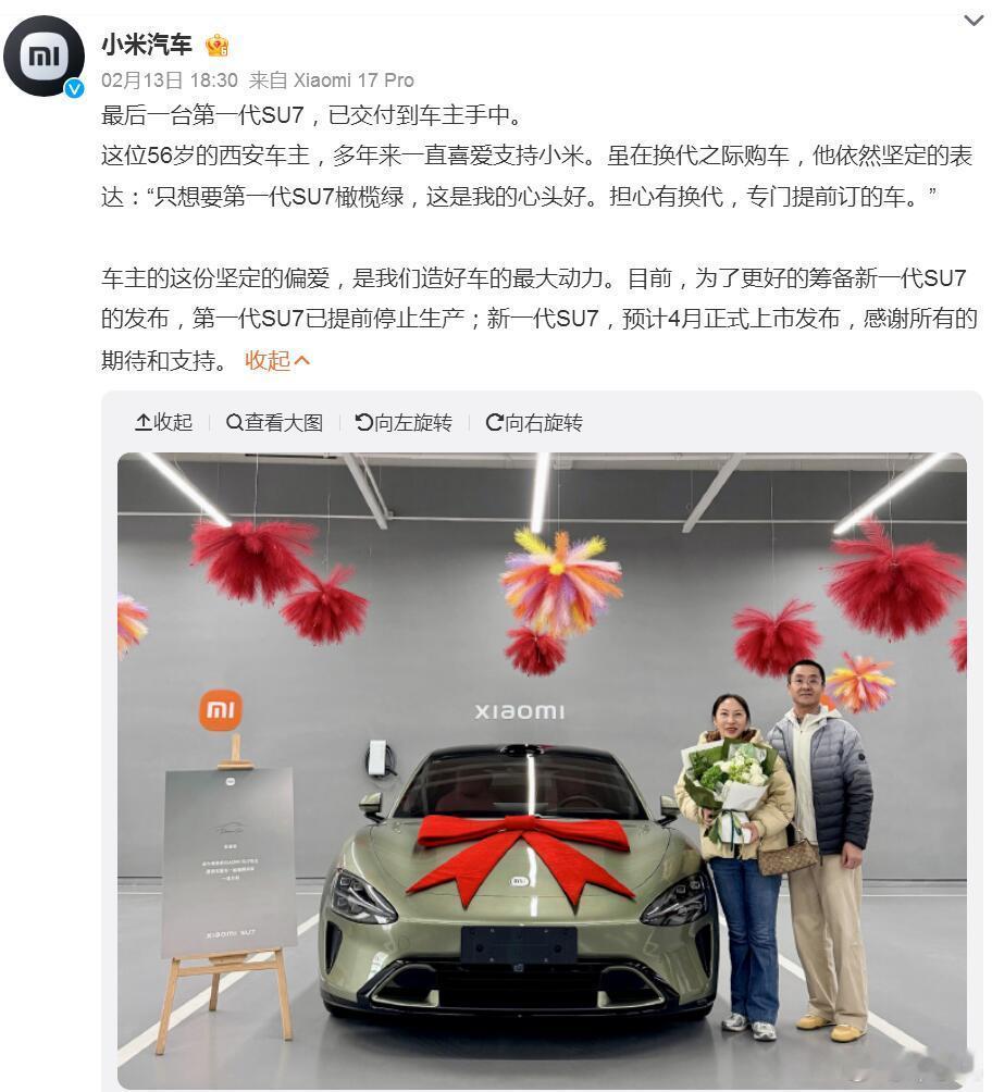 老款小米SU7已经停产了,现在最后一台也交付给了车主,而且还是一位56岁的“老米粉”,看得出来小米的影响力不仅是在年轻人当中,只要它的产品力足够强,就可以辐射到更大的年轻段里。目前小米汽车交付总数已经突破了60万台,两三年时间就能有如此惊艳的成绩,小米确实创造了一个奇迹。而这个表现,恐怕也是黑子们黑不动的!最后一台第一代SU7已交付最后一台初代SU7是橄榄绿色小米汽车累计交付超60万台