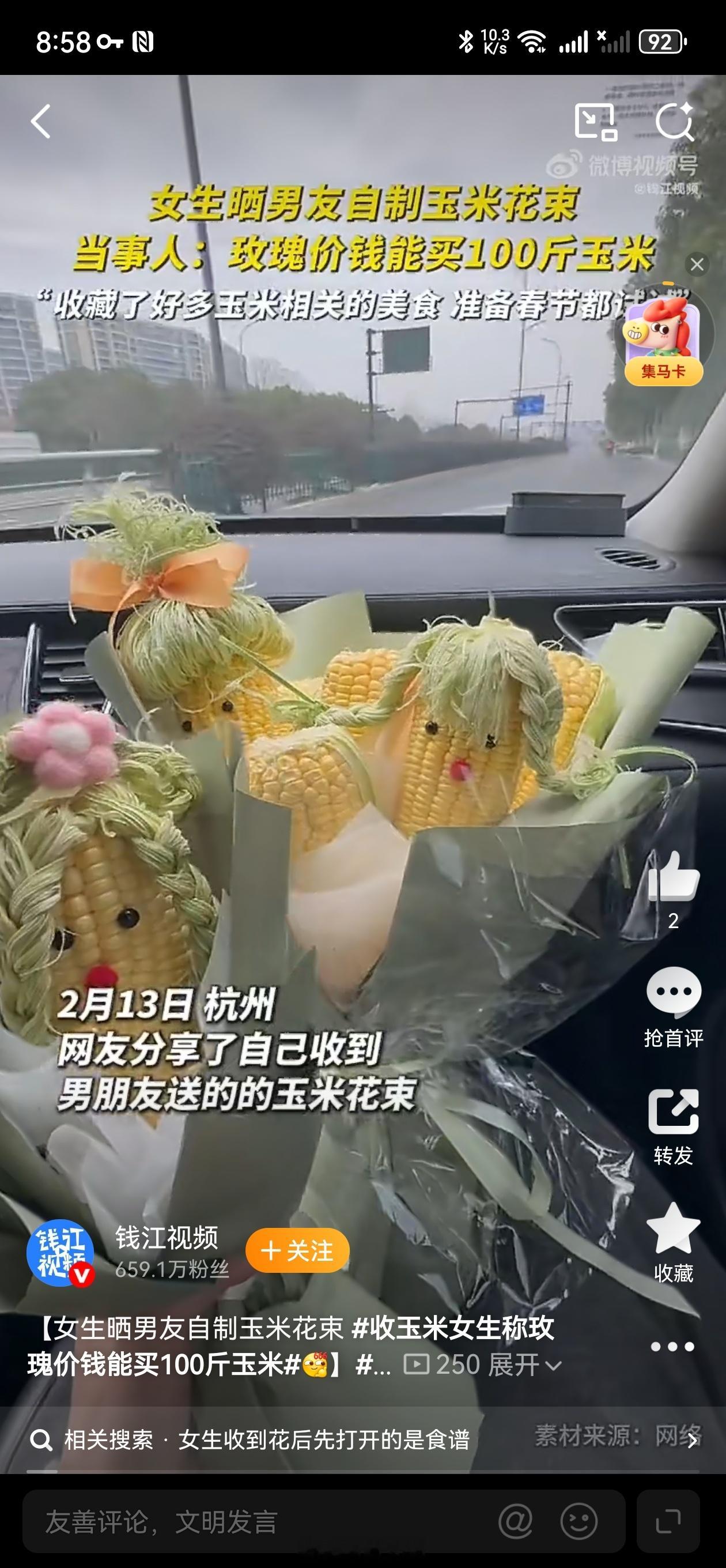 收玉米女生称玫瑰价钱能买100斤玉米2月14日,杭州一女生收到男友亲手制作的玉米花束,金黄饱满、包装精致,颜值不输鲜花。她直言,一束玫瑰的价格差不多能买近100斤玉米,务实又暖心。女生收到花后先打开的是食谱