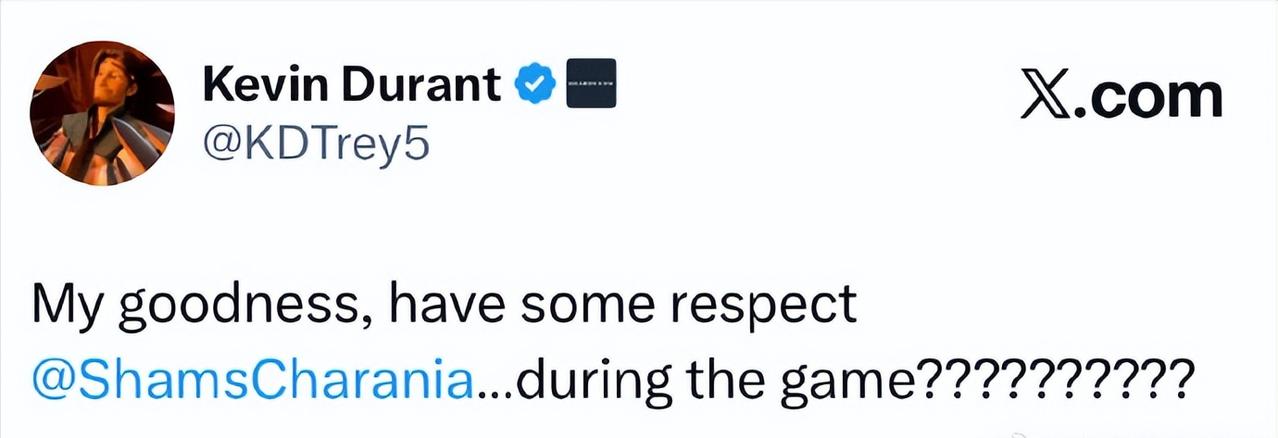 杜兰特发文调侃Shams:“我的天,能不能有点尊重?在比赛期间这样?” Shams打了全明星周末的名人赛,而在比赛期间,拉文被爆出全明星后左手手术赛季报销,Shams就在场边用手机查看消息,最后是另一个著名记者Haynes完成了爆料首发,Shams被抢了先手。 而在此前,一些媒体、记者经常批评球员在替补席吃东西、看手机,认为他们不尊重比赛。 杜兰特这次发文,是以彼之道还施彼身,来了个活学活用。