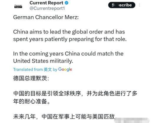 赶在访华之前,德国总理默茨表示,中国的目标是领导全球秩序,并为这一角色耐心准备了多年。未来几年,中国可能在军事上与美国匹敌。 最近大家都在盯着德国总理默茨的动向,毕竟他已经确定要在2月24日开启访华之行,还带了一支涵盖汽车、化工、半导体等支柱产业的豪华企业团,明眼人都能看出,这次访华对中德双方来说都不一般,而就在访华前夕,默茨抛出了一番引人关注的话,也让大家对这次访问多了几分期待和讨论。 赶在访华之前,德国总理默茨表示,中国的目标是领导全球秩序,并为这一角色耐心准备了多年。 未来几年,中国可能在军事上与美国匹敌,这番话不是在什么闭门会议上说的,而是面向公众的公开表态,结合他即将访华的背景,更显得有分量,大家也能明显感觉到,这不是默茨一时兴起的随口一提,背后其实是对中国这些年发展的清晰观察。 默茨说中国为领导全球秩序耐心准备了多年,这话其实能从很多地方找到印证,这些年中国提出的全球治理倡议,已经得到了150多个国家和国际组织的响应,还有43个国家成为“全球治理之友小组”创始成员,就连法国、加拿大等西方国家,也把这个倡议写入了联合声明。 而且中国从来不是只喊口号,还实实在在做了很多事,比如和30多个国家一起成立国际调解院,推动金砖机制扩员,支持非盟加入二十国集团,一步步提升发展中国家在全球事务中的话语权。 除此之外,中德之间的经贸往来也能看出中国的发展底气,2025年前三季度,中国再次成为德国最大贸易伙伴,贸易额达到1859亿欧元,而且超九成受访德企都不想撤出中国市场,还有一半以上计划增加在华投资。 就像江苏太仓,一个不到百万人口的小城,就聚集了560多家德国企业,其中还有60家行业“隐形冠军”,这背后正是中国完整的工业体系和高效的供应链在支撑,也从侧面印证了中国这些年的积累和准备。 至于默茨提到的,未来几年中国可能在军事上与美国匹敌,近期也有不少直观的表现。 今年新春,中国空军的拜年视频里,一整排歼-20A整齐列阵,这款五代机不仅有标志性的“粗脖子”气动优化设计,还换了新一代大推力发动机,隐身材料也实现了全机覆盖,已经大批量列装一线作战部队。 而且2025年全军也一直在推进实战化训练,深化基础训练、强化指挥训练,还运用科技手段丰富练兵方式,推动无人、网电等新质力量发展,一步步提升自身的军事能力。 其实结合默茨近期的其他表态,也能更好理解他这番话的语境,就在不久前的欧洲工业峰会上,他还痛批欧盟审批僵化、效率太低,直言欧盟再不改变就会失去竞争力,甚至公开呼吁欧洲向中国学习高效审批经验。 而德国本身也连续两年陷入技术性衰退,急需通过对华合作稳定供应链、寻找发展机遇,这或许也是他访华前主动提及中国发展的重要原因。 眼下,距离默茨访华越来越近,相信他这番表态,也会为这次中德高层互动,奠定一个务实交流的基础。 本文内容皆为个人看法,如有更好的见解欢迎在评论区留言讨论。