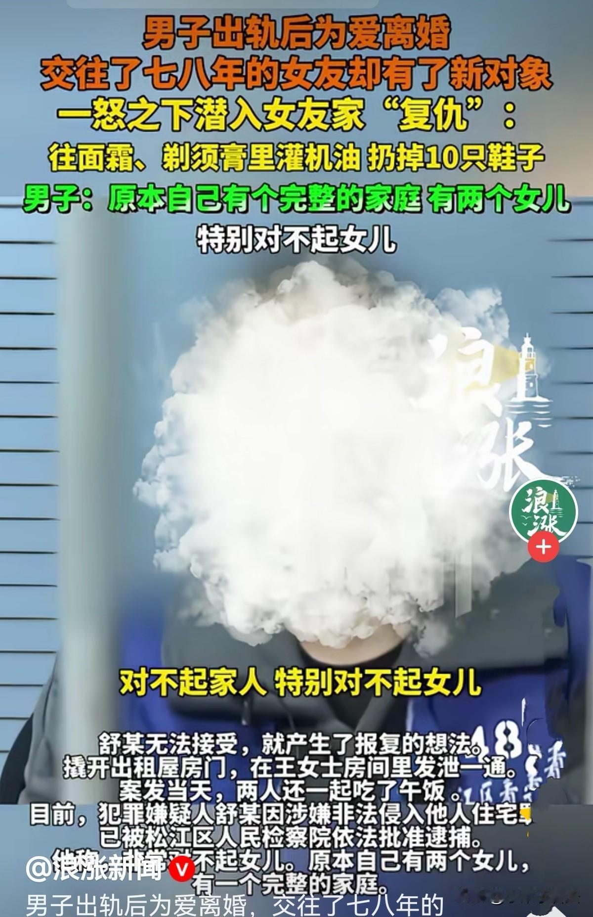 负心汉最好的结局!上海松江,男子婚内出轨,为真爱抛妻弃女,与女友交往8年,倾尽所有积蓄,女友有求必应。万没想到,女友在与他交往时,又有了新对象,提出分手。男子气不过,一怒之下潜入女友出租屋,往面霜、剃须膏里灌机油进行报复,还扔掉10只鞋子。男子被抓后说:原来自己有一个完整的家庭,有两个女儿,特别对不起女儿。网友:你再扔几件衣服,我还佩服你是条汉子! 松江警方处理了一起让人啼笑皆非又细思极恐的案件。 一名男子为了新欢抛妻弃子,倾尽所有付出一切,可当女友转身找到新欢提出分手后,他彻底失控,用一种极其极端、恶心的方式展开了报复。 吴小姐与王女士及其男友在一起合租房。一日她回到家中,闻到了一股刺鼻又怪异的气味。 起初她以为是东西变质,可越闻越不对劲,那股味道更像是某种工业用油。 紧接着,她惊恐地发现,客厅里自己摆放的十几只鞋子,竟然莫名其妙少了十只,而且丢的还不是成双成对的,更像是被人故意随手拿走的。 王女士也赶回了家,一进门更是吓出一身冷汗,屋里弥漫着淡淡的天然气异味,万幸窗户一直开着,才没发生危险。 两人赶紧检查房间,这不查不知道,一查彻底炸了锅:王女士衣柜里的好几件衣服被人用利器划得稀烂,地板上到处都是油腻腻的污渍。 而最让人崩溃的是,她平时用的面霜、护肤品,以及男友朱先生的电动剃须刀、剃须膏里面,竟然全都被灌进了黑乎乎、气味刺鼻的机油。 值钱的电脑、手机、现金一分没少,偏偏针对私人用品下手,还莫名其妙丢了鞋子,明眼人一看就知道,这根本不是小偷入室盗窃,而是熟人恶意报复。 随后,他们报警。在警方的细致排查下,线索很快指向了王女士的前男友舒某。 而随着真相被揭开,这段扭曲的感情关系,也彻底暴露在众人面前。 舒某和王女士在一起长达七八年,这段感情从一开始就不光彩。 当时舒某已有家室,却在和王女士的交往中越陷越深,他坚信自己遇到了真爱,为了能和王女士名正言顺地在一起,舒某毅然和原配妻子离婚。 他几乎掏空了自己多年积蓄,对王女士百依百顺、有求必应,他把所有的赌注都押在了这个女人身上,满心盼着能和她重组家庭。 可现实并没有按照他的剧本走。王女士觉得舒某并不是能共度余生的合适人选,两人未来结婚的希望十分渺茫,于是开始刻意疏远、冷淡舒某。 直到不久前,王女士直接摊牌,告诉舒某自己已有了新男友,提出分手。 这句话,成了压垮舒某的最后一根稻草。 他无法接受这个结局:自己抛妻弃子、付出一切,到头来却被一脚踢开,成了一个笑话。 巨大的落差和不甘心,让他内心充满怨恨,爱意彻底转化为狰狞的恨意,一门心思想要报复,让王女士和她的新男友付出代价。 早在案发二十多天前,心存怨念的舒某就曾偷偷潜入过王女士的卧室发泄情绪,但当时王女士念及旧情,并没有选择报警。 可这一次,被彻底甩了的舒某,案发当天中午,舒某事先准备好机油,趁着没人,攀爬外墙潜入了王女士的合租房。 一进门,积压已久的怒火彻底爆发,他疯狂地划烂王女士的衣服,将机油肆意泼洒在地上,随后又把恶毒的心思用在了最私密的用品上:面霜、护肤水、剃须膏、剃须刀,能灌的全灌上机油。 他就是要让王女士和她的新男友生活不得安宁,一用东西就想起他带来的噩梦。 为了混淆警方视线,不让人一眼就看出目标是王女士,舒某还顺手把室友吴小姐的十只旧鞋,从阳台直接扔到了楼下的草丛里,做完这一切,他才仓皇逃离。 舒某以为自己做得天衣无缝,却没想到警方很快就锁定了他。 到案后,他对自己非法侵入住宅、恶意报复的行为供认不讳。 他坦言自己和王女士在一起时,是她催自己离婚,其实他的老婆对他很好,当时很纠结,可还是为了她离婚! 原本自己有个完整的家庭,有两个女儿,他特别对不起女儿! 有人说,仅对不起女儿?对前妻一点愧疚也没有?渣男一个比一个渣! 有人说,现世报!前妻笑晕了!祝你打一辈子光棍。 还有人说,这潦草又轻飘飘的报复没有20年脑血栓都想不出来! 目前,犯罪嫌疑人舒某因涉嫌非法侵入他人住宅罪,已被松江区人民检察院依法批准逮捕,等待他的,将是法律的严惩。 《刑法》第254条规定:未经住宅主人同意或无法律依据,非法强行闯入他人住宅,或经要求退出仍拒不退出,严重影响他人居住安宁的行为‌。刑罚为3年以下有期徒刑或拘役。‌‌ 这场由婚外情开始、由报复结束的闹剧,最终以一个荒唐又可悲的结局收场。 对此您怎么看?