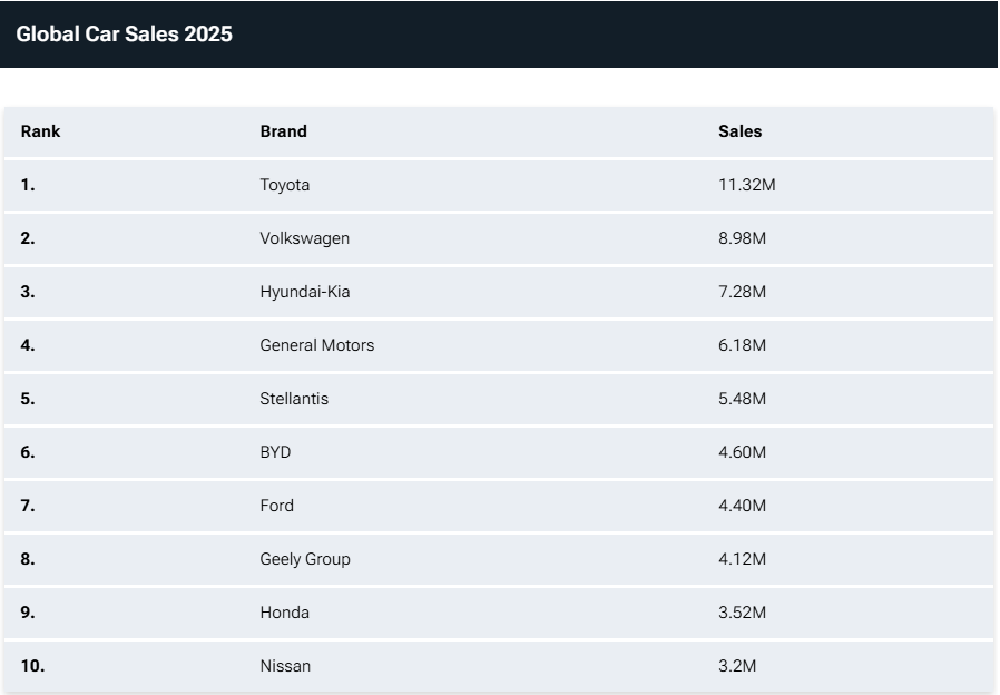 据外媒报道,比亚迪在全球销量排名中超越福特,升至全球第 6 位。 比亚迪去年全球销量达460 万辆,同比增长 7.7%。反观福特,销量同比下滑 2%,仅为440 万辆。 而老对手通用汽车销量同比增长 6.8%,达到618 万辆,福特的处境更加艰难。 福特虽在美国市场实现增长,但在欧洲,尤其是中国市场的占有率持续下滑。 在中国市场,以比亚迪、小米、吉利汽车为首的本土车企,凭借高性价比与技术实力快速扩大市场份额。 而福特在重整电动化战略过程中,计入了195 亿美元的相关费用,经营负担进一步加重。 中国虽是比亚迪最大市场,但其出口也在快速增长。 去年比亚迪对欧洲、南美、亚洲等地出口量增至105 万辆,预计今年将达到130 万辆。 目前中国国内纯电(EV)与插混(PHEV)需求出现放缓迹象,对比亚迪而言,海外市场增长变得更加重要。 另一方面,丰田以1132 万辆销量,连续 6 年稳居全球第一。 大众以898 万辆位列第 2,现代起亚728 万辆第 3,通用618 万辆第 4,Stellantis 集团548 万辆第 5。