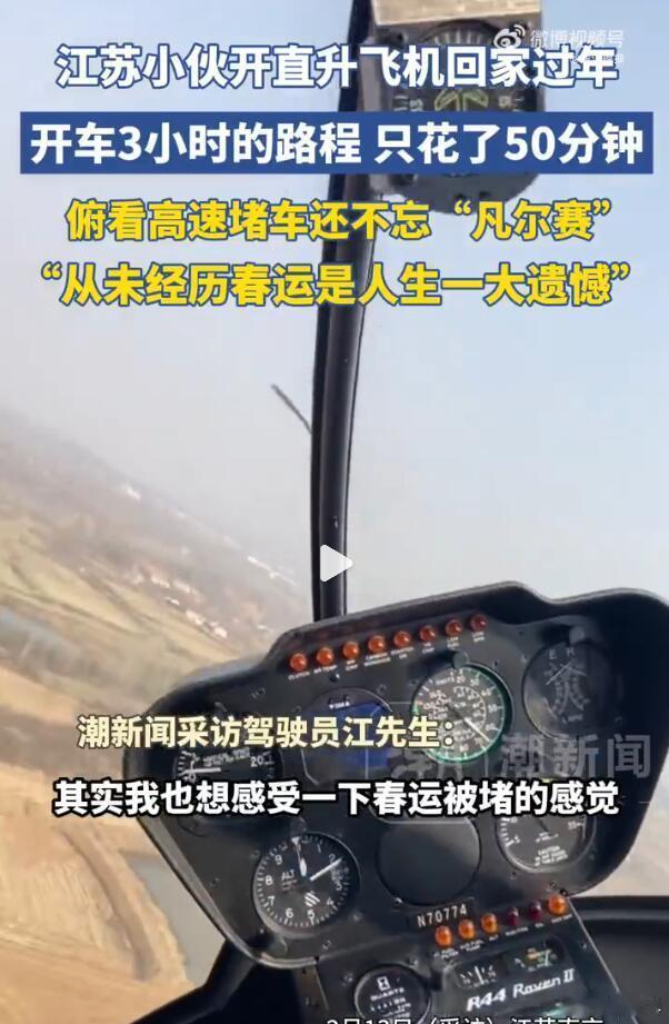 有的人回家过年开直升机,从高空欣赏地面的庞大车流,感叹自己没能感受路上的拥堵。有的人过年回家只能坐绿皮车,人和货物挤在一起,空气污浊,起身换个姿势都难。只能说,世界的参差太大了,你买不起直升机,是因为你工作不够努力,加油吧,多加班多熬夜,生活自然会好起来的。小伙开直升机回家称遗憾未经历春运小伙开直升机回家206公里飞50分钟