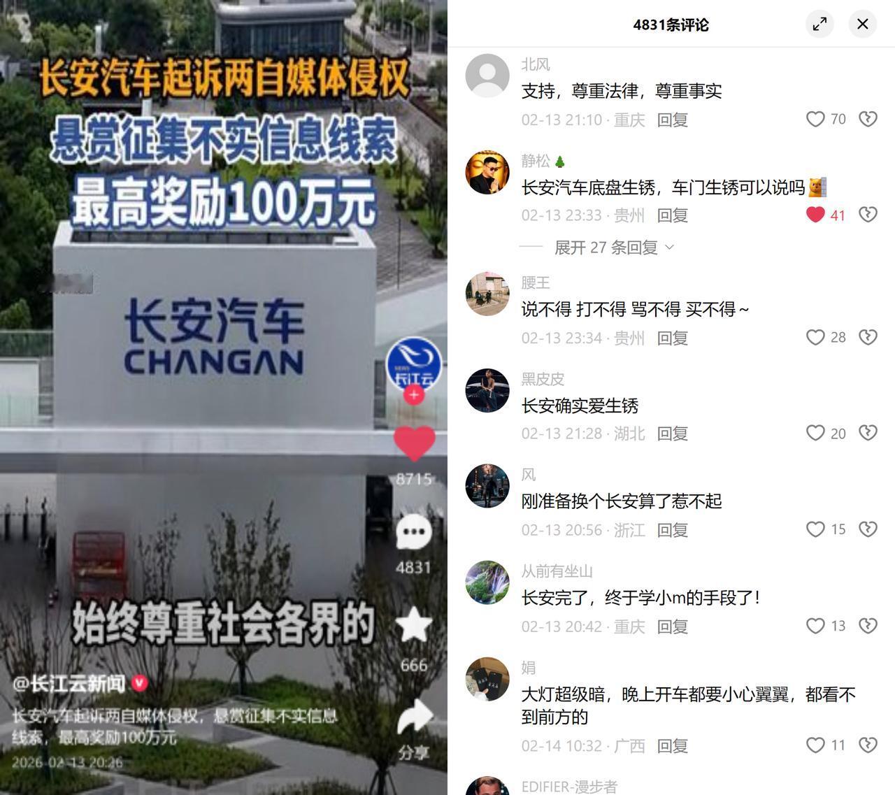 某自主车企起诉俩自媒体,悬赏百万! 2月13号,有家自主车企发声明,起诉两个自媒体侵权并已立案,还悬赏100万征集抹黑线索。 可从头到尾,没说人到底说了啥,是造了破产、高管丑闻的假,还是吐槽了车主都在说的生锈、大灯暗? 这操作太耐人寻味了。 要是真的恶意造谣,直接把内容晒出来让大家评理不就完了?藏着掖着,反倒让车主们心慌:以后敢说自己车的真实问题吗? 看看大家怎么说,一堆人说这品牌确实爱生锈、大灯超级暗,这难道不是消费者的真实感受?难不成说句真话也成了侵权? 现在搞成这样,普通人连吐槽个质量问题都要掂量半天,怕一不小心就成了被起诉的造谣者,这才是最寒心的。 企业维权没问题,但能不能把不实信息的边界划清楚?别让消费者连说真话的胆都没了!