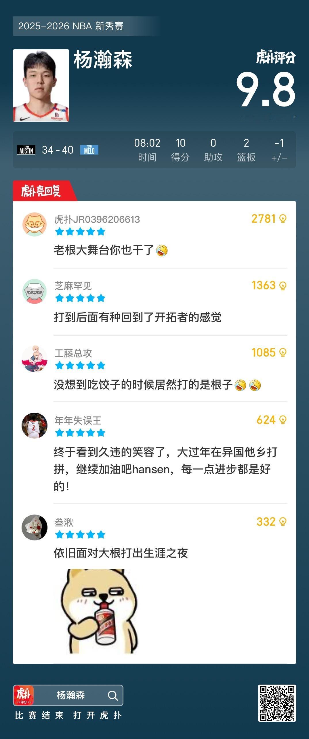 杨瀚森全场出战8分钟,投篮5中4,三分2中1、罚球1中1得到10分2篮板。
