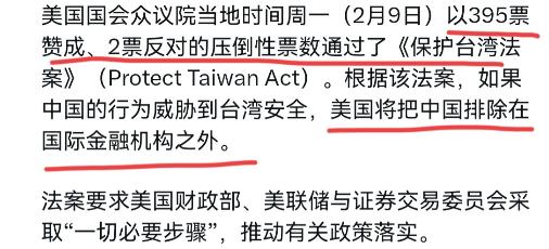 美国完全没有把我们的警告听进去,美国做了一个硬动作声称,如果中国的行为威胁到台湾安全,美国将把中国排除在国际金融机构之外。2月9日,美国国会众议院以395票赞成、2票反对的压倒性票数通过了《保护台湾法案》。根据该法案,如果中国的行为威胁到台湾安全,美国将把中国排除在国际金融机构之外。   这国际金融机构是啥?那可是全球金融体系的核心,像国际货币基金组织、世界银行这些,都是各国经济往来的重要平台。美国这一招,明显是想在经济上给中国来个“下马威”。   这法案在众议院通过后,还得送参议院审议,要是参议院也点头了,最后还得美国总统签字才能生效。   但就目前这架势,美国显然是一副“势在必行”的模样,根本没把咱们的警告当回事。   咱们刚明确告诉美国,必须慎重处理台湾问题,这可是中国的核心利益,容不得半点马虎。可美国倒好,不仅没收敛,反而变本加厉,用国内法来干涉中国内政,这用心,简直险恶到了极点。   美国这一举动,无疑是在给“台独”分子打气撑腰。那些“台独”分子本来就心存侥幸,觉得有美国在背后撑腰,就可以肆无忌惮地搞分裂活动。现在美国又抛出这么个法案,他们还不乐开了花,觉得自己的“靠山”更硬了。   可他们忘了,台湾是中国的一部分,这是国际社会公认的事实,美国再怎么折腾,也改变不了这个铁一般的事实。   美国这么做,其实也是在试探中国的底线。近年来,中国在经济、军事、科技等各个领域都取得了长足的进步,国际地位也日益提升。   美国看着中国的发展势头,心里那是又嫉妒又害怕,总想着找机会给中国使绊子。台湾问题就成了他们眼中的“突破口”,想通过在台湾问题上的挑衅,来遏制中国的发展。   可他们也不想想,中国可不是好惹的。在经济上,中国已经是全球第二大经济体,对世界经济的贡献率超过30%。   美国要是真把中国排除在国际金融机构之外,那对全球经济来说,无疑是一场巨大的灾难。   到时候,不仅中国的经济会受到影响,美国自己的经济也跑不了。毕竟,中美两国的经济联系那是千丝万缕,谁也离不开谁。   在军事上,中国的军事实力也在不断提升。解放军的航母编队、五代战机、国产航母等先进装备,都是中国维护国家主权和领土完整的坚强后盾。美国要是敢在台湾问题上越雷池一步,解放军绝对不会坐视不管。到时候,美国可就得好好掂量掂量自己的分量了。   而且,美国这么做,也不得人心。国际社会大多数国家都坚持一个中国原则,反对任何形式的“台独”分裂行径。美国搞这么个法案,不仅违背了国际法和国际关系基本准则,也损害了国际社会的共同利益。到时候,美国在国际上只会更加孤立无援。   咱们再来说说这法案本身。美国国会通过法案,那是他们国内的事情,但想用国内法来干涉别国内政,那就大错特错了。   国际法和国际关系基本准则都明确规定,各国的主权和领土完整应该得到尊重,不干涉别国内政是基本原则。美国这么做,无疑是在践踏国际法和国际关系基本准则,是在开历史的倒车。   美国这么做,也暴露了他们的霸权心态。他们总觉得自己是世界的老大,可以随意对其他国家指手画脚,甚至动用武力或经济制裁等手段来达到自己的目的。   可时代变了,现在的世界已经不是美国一家说了算的时代了。各国都在追求独立自主的发展道路,都在努力维护自己的国家利益和民族尊严。美国要是还抱着霸权心态不放,最终只会自食其果。   对于美国的这一挑衅行为,中国肯定会采取坚决有力的措施来应对。咱们已经多次明确表示,台湾是中国的一部分,台湾问题是中国内政,不容任何外部势力干涉。   中国政府和人民维护国家主权和领土完整的决心坚定不移,任何企图分裂自己国家的人都将遭到人民的唾弃和历史的审判。   美国应该好好反思自己的行为,不要再在台湾问题上玩火自焚了。只有尊重中国的主权和领土完整,停止干涉中国内政,才能推动中美关系健康稳定发展。否则,等待美国的,只能是更加严重的后果。