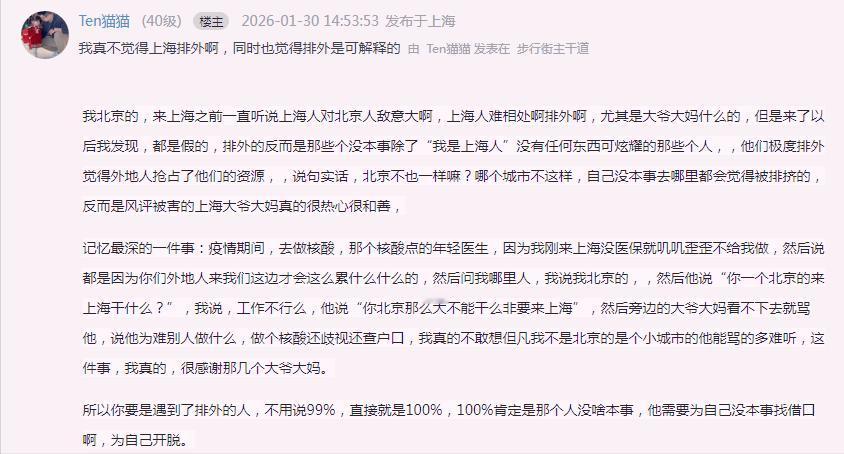 网友:我真不觉得上海排外啊,同时也觉得一些上海人排外是可解释的! 我北京的,来上海之前一直听说上海人对北京人敌意大啊,上海人难相处啊排外啊,尤其是大爷大妈什么的,但是来了以后我发现,都是假的,排外的反而是那些个没本事除了“我是上海人”没有任何东西可炫耀的那些个人,,他们极度排外觉得外地人抢占了他们的资源,,说句实话,北京不也一样嘛?哪个城市不这样,自己没本事去哪里都会觉得被排挤的,风评被害的上海大爷大妈真的很热心很和善, 记忆最深的一件事:疫情期间,去做核酸,那个核酸点的年轻医生,因为我刚来上海没医保就叽叽歪歪不给我做,然后说都是因为你们外地人来我们这边才会这么累什么什么的,然后问我哪里人,我说我北京的,然后他说“你一个北京的来上海干什么?”,我说,工作不行么,他说“你北京那么大不能干么非要来上海”,然后旁边的大爷大妈看不下去就骂他,说他为难别人做什么,做个核酸还歧视还查户口,我真的不敢想但凡我不是北京的是个小城市的他能骂的多难听,这件事,我真的,很感谢那几个大爷大妈。 所以你要是遇到了排外的人,不用说99%,直接就是100%,100%肯定是那个人没啥本事,他需要为自己没本事找借口啊,为自己开脱。