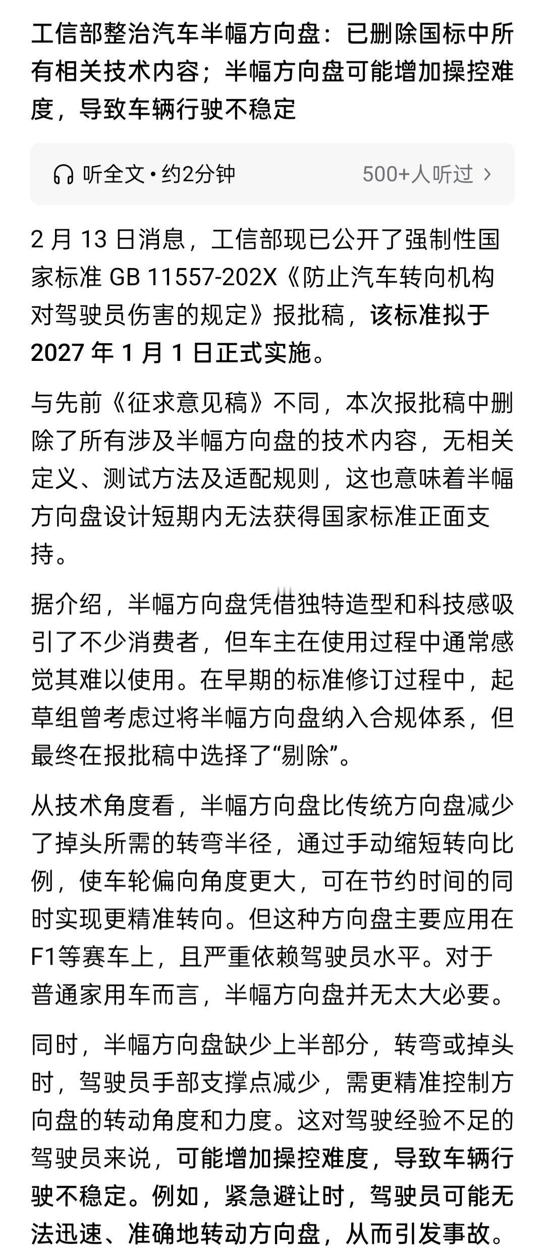 有媒体报道,工信部将整治汽车半幅方向盘,本次报批稿中删除了所有涉及半幅方向盘的技术内容,无相关定义、测试方法及适配规则,这也意味着半幅方向盘设计短期内无法获得国家标准正面支持。