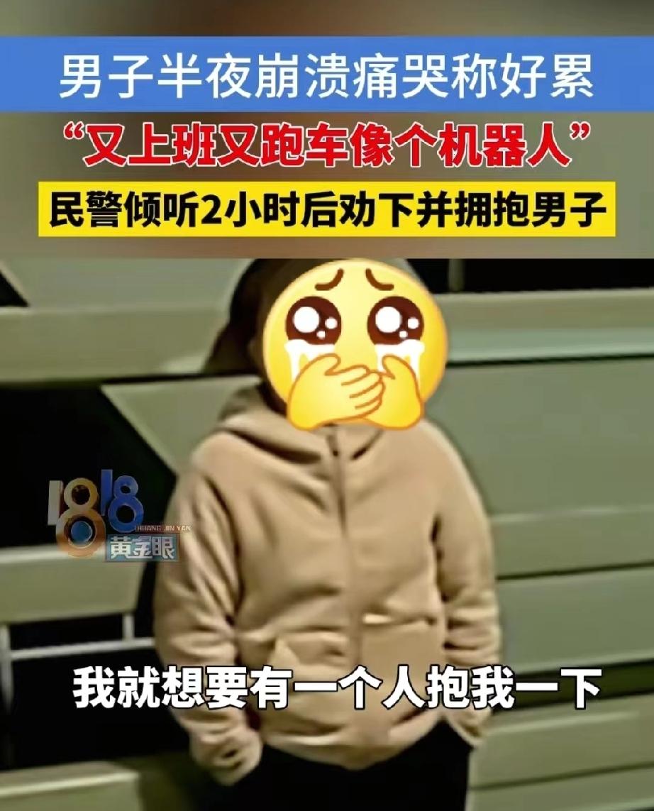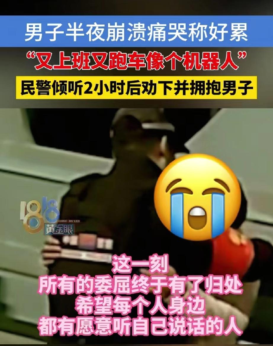 男人太难了!浙江温州,民警接到报警,一男子半夜在桥上崩溃痛哭,疑似有轻生的征兆。原来,男子为了生计,白天上班、晚上跑滴滴,还有几个副业,感觉自己就像机器人一样,累的快要崩溃了。民警静静的倾听了两个多小时,接下来的举动温暖了男子,让他的委屈有了归处。 2月13号晚上,温州的一座大桥上,发生了让人看着特别心疼的一幕。 当地派出所突然接到群众报警,说桥上有一名男子独自站在栏杆边,情绪非常激动,一直在崩溃大哭,看起来状态很不对劲,担心他会做出傻事,希望民警赶紧过来帮忙。 接到报警后,值班民警一刻也不敢耽误,立刻驱车赶往现场。 到了桥上后,民警远远就看到了那名男子,他一个人靠在桥边,身体微微发抖,哭声在安静的夜里显得格外刺耳,整个人都被绝望的情绪包裹着,看起来既无助又脆弱。 民警没有立刻上前大声劝说,而是慢慢走到男子身边,用最温和的语气询问他发生了什么事。 就是这一个小小的举动,让一直强撑着的男子彻底破防了,他再也忍不住,对着民警哭诉起了自己的委屈和压力。 男子说出了他的委屈,每天的生活就像一个上了发条的机器人,一刻都停不下来。 为了撑起生活,他白天要在公司正常上班,从早忙到晚,一刻都不敢松懈。 好不容易等到下班,别人都能回家休息,他却连一口热饭都顾不上吃,又要匆匆出门跑滴滴,一直跑到深夜才能收车。 就算这样,他还是觉得不够,又挤时间做了好几个副业,只要能赚钱的活,他都咬牙接下来,哪怕累得腰都直不起来,也从来不敢说一句苦。 长时间连轴转的日子,让他身心都到了崩溃的边缘。 他感觉自己每天除了赚钱、干活,没有一点属于自己的时间,累到连喘口气的功夫都没有。 更让他难受的是,身边没有人真正理解他的辛苦,也没有人关心他累不累、难不难。所有人都只看到他在拼命赚钱,却没人知道他心里藏了多少委屈,多少疲惫。 那天晚上,他实在撑不住了,一个人来到桥上,越想越觉得孤独,越想越觉得压抑。他说自己什么都不想要,就想有个人能好好听他说说话,能给他一个简单的拥抱。 可在这座城市里,他翻遍了通讯录,却找不到一个可以倾诉的人,所有的压力和委屈,只能自己一个人扛着。 民警就这样安安静静地听着,没有打断他,也没有不耐烦,整整听了两个多小时。 男子把心里所有的苦、所有的累、所有的孤独全都哭着说了出来,积压了许久的情绪,终于找到了一个出口。 等男子情绪稍微平复一点之后,民警看着眼前这个被生活压得喘不过气的男人,主动张开双臂,给了他一个大大的、结实的拥抱。 就是这一个拥抱,让男子所有的坚强瞬间瓦解,所有的委屈终于有了归处,长久以来的压抑和孤独,在这一刻全都释放了出来。 经过民警耐心的安抚和劝说,男子的情绪慢慢稳定下来,也放弃了不好的想法。 《人民警察法》第二十一条规定:人民警察遇到公民人身、财产安全受到侵犯或者处于其他危难情形,应当立即救助;对公民的报警案件,应当及时查处。 本案中,群众报警男子有轻生风险,民警快速到场、耐心劝导两小时并暖心拥抱,成功稳定其情绪、消除危险,完全履行了法定救助职责,处置规范合法,既保障了公民生命安全,也符合执法程序要求。 不过,男子白天上班、夜间跑滴滴、兼做多份副业,长期超负荷打拼,身心俱疲却无人理解、无人倾诉,深夜在桥上崩溃,正是普通人被生活重压压垮的真实写照。 他所求不过一句倾听、一个拥抱,这份朴素的情感需求,戳中了许多打拼者的共鸣,让人深感心疼。 民警依法履职之外,用倾听与拥抱传递温度,让法律有了人情味儿,不仅彰显了执法为民的初心,也让社会多了一份善意与包容。 生活从来都不容易,每个人都在默默扛着压力前行。 希望每一个辛苦打拼的人,都能遇到愿意倾听自己、温暖自己的人,累了就停下来歇一歇,别总是一个人硬扛。
