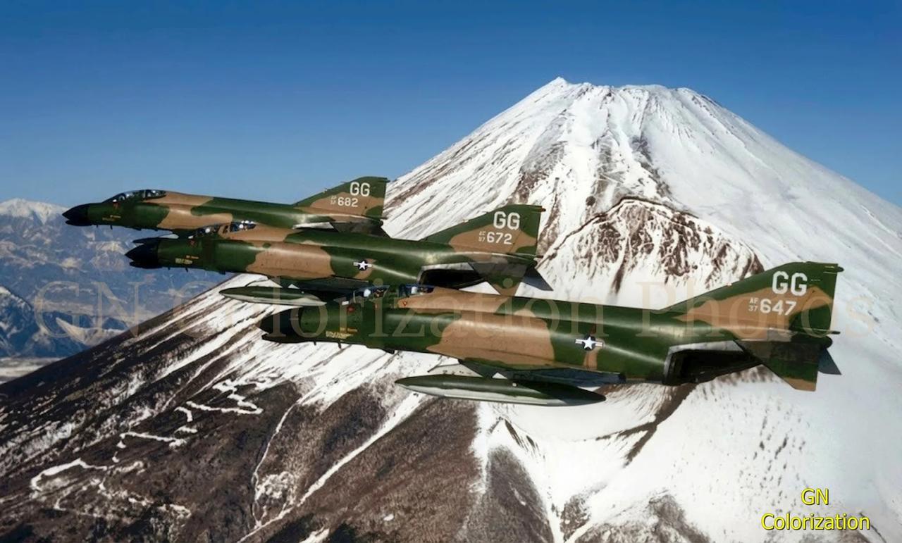 1968年,美国空军F-4C幻影飞越白雪皑皑的富士山。