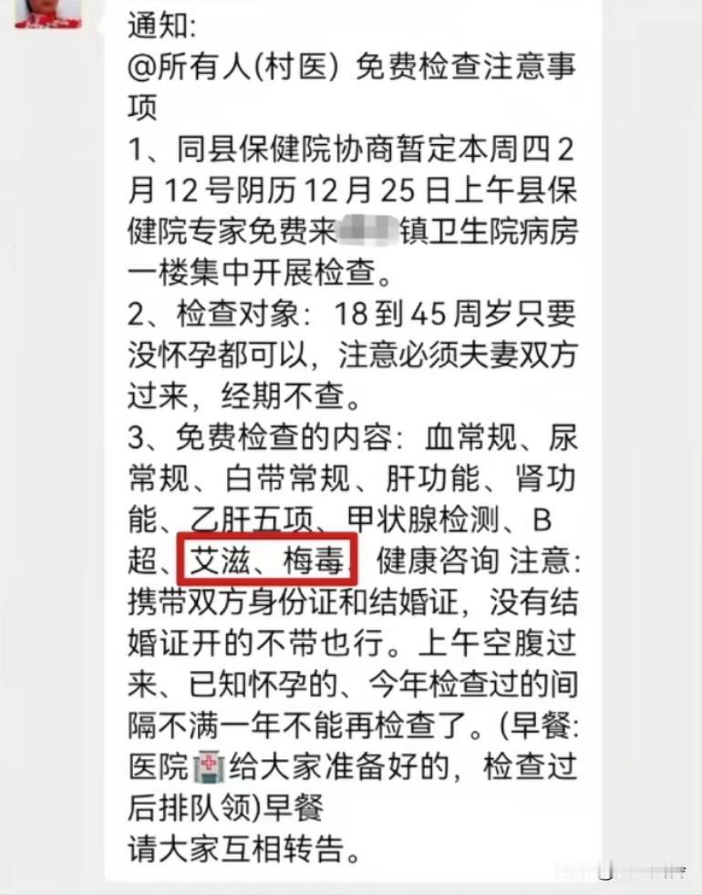 村里发的通知,夫妻必须都到场,务工返乡先检查艾滋病和梅毒 打工的男人回家了,万一传给老婆,年后单身的老婆又传给…整个村都完了。一生二,二生三,三生万物。村长对村民负责,也是对自己负责。外面假夫妻,过年了回家真夫妻,这样的太多了。 现在的男女都太开放了,管好自己,不烂交,就可以自保了,不是这种病严峻,主要还是人完了