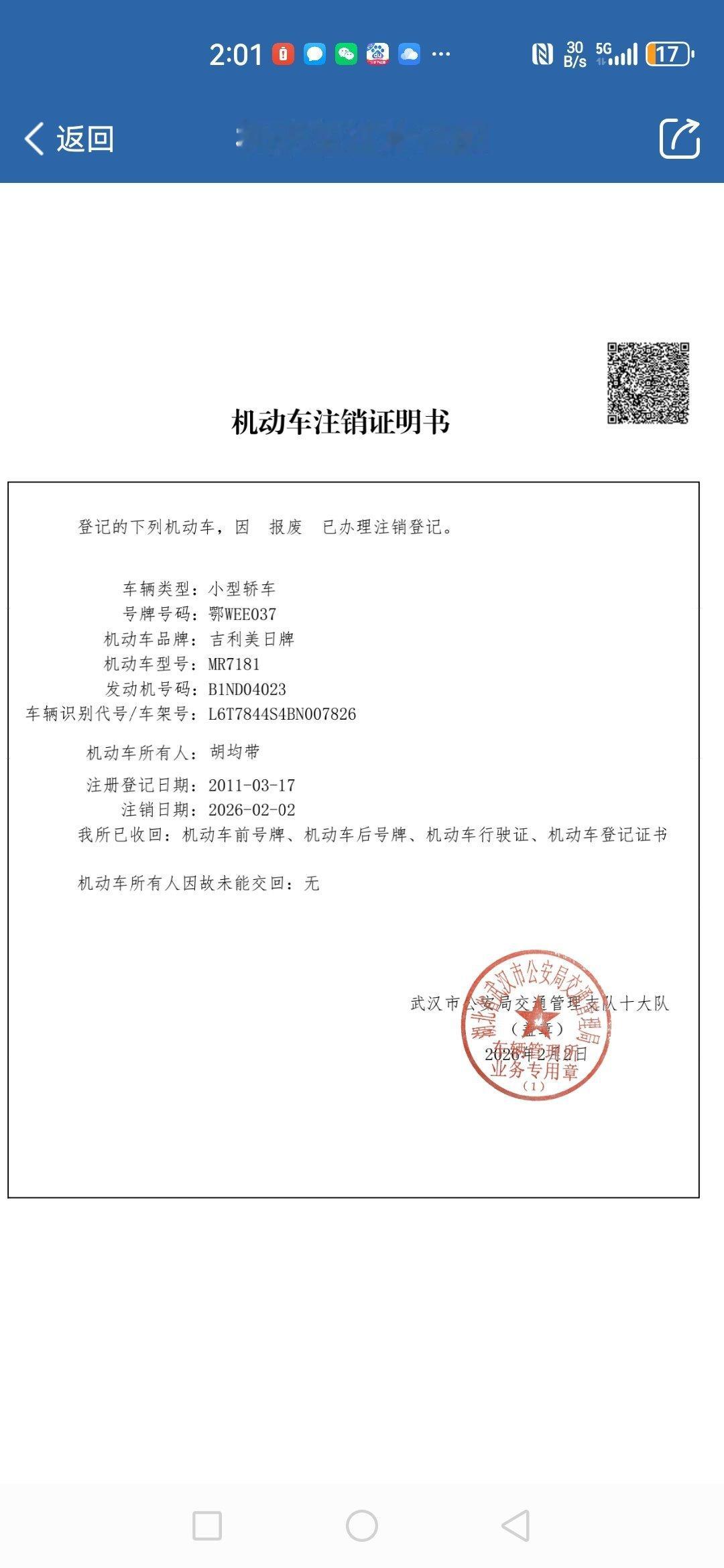 今年2月2日,我报废了一台2011年的吉利小车,买新车可以拿报废补贴,新能源按照车价百分之十二补贴,但是要交一半的购置税,最高补2万。如果不买新车,这个报废名额就浪费了。
